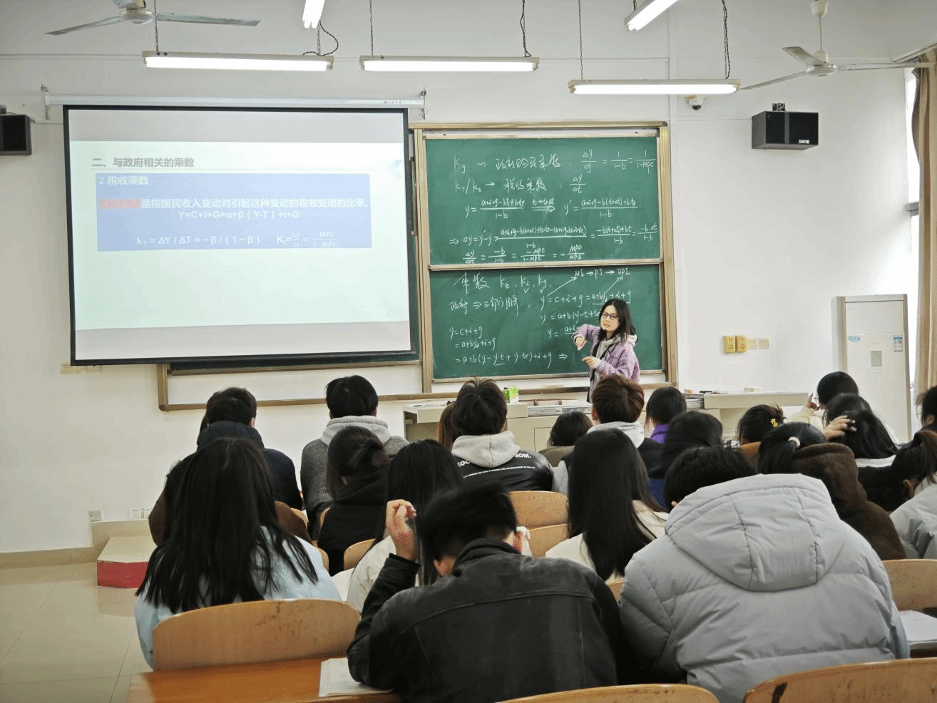 本节课重点是乘数效应,吕老师通过板书演示,详细推导了政府支出乘数、税收乘数以及转移支付乘数的计算过程。从基础公式到具体应用,每一步都清晰呈现,帮助学生理解乘数效应的作用机制。例如,假设政府增加100亿元支出,推导出最终国民收入的增长倍数,直观展示了财政政策对经济的拉动作用。这种传统的板书教学方式,不仅让学生感受到经济学的逻辑之美,也加深了学生对理论的理解。