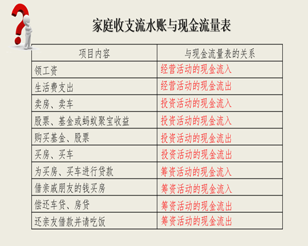 其次,陈老师介绍现金流量表的结构,现金流量表结构分为三项,即经营活动的现金流、投资活动现金流及筹资活动现金流,解读各结构内部的具体项目构成及含义。为了解释现金流量表的构成,陈老师用家庭生活开支流水账举例,形象清楚,通俗易懂。