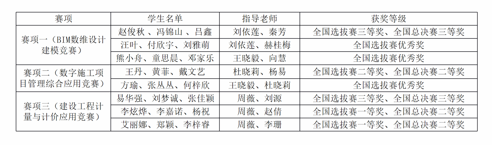 赛项三(建设工程计量与计价应用竞赛):参赛团队需运用BIM土建及安装算量等专业软件,完成三维建模、工程量清单编制及招标控制价文件导出等全流程操作,综合考核学生“识图-建模-计量-计价”的综合职业能力。此次获全国选拔赛一等奖2项,三等奖1项,全国总决赛二等奖2项,三等奖1项。