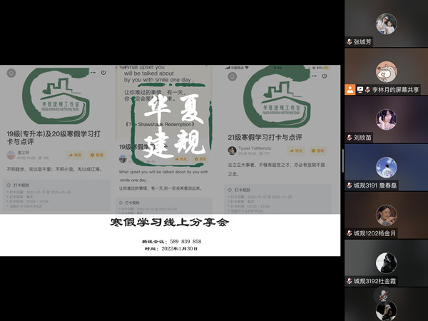 2022年1月30日14点整,华夏建规工作室开展2022年寒假学习成果线上分享会。科研部部长张城芳、科研部产学合作中心教师杨亨、刘雄、土木建筑工程学院城乡规划系主任徐亚琪及城乡规划专业学生参加,会议由城乡规划系副主任张力文主持。