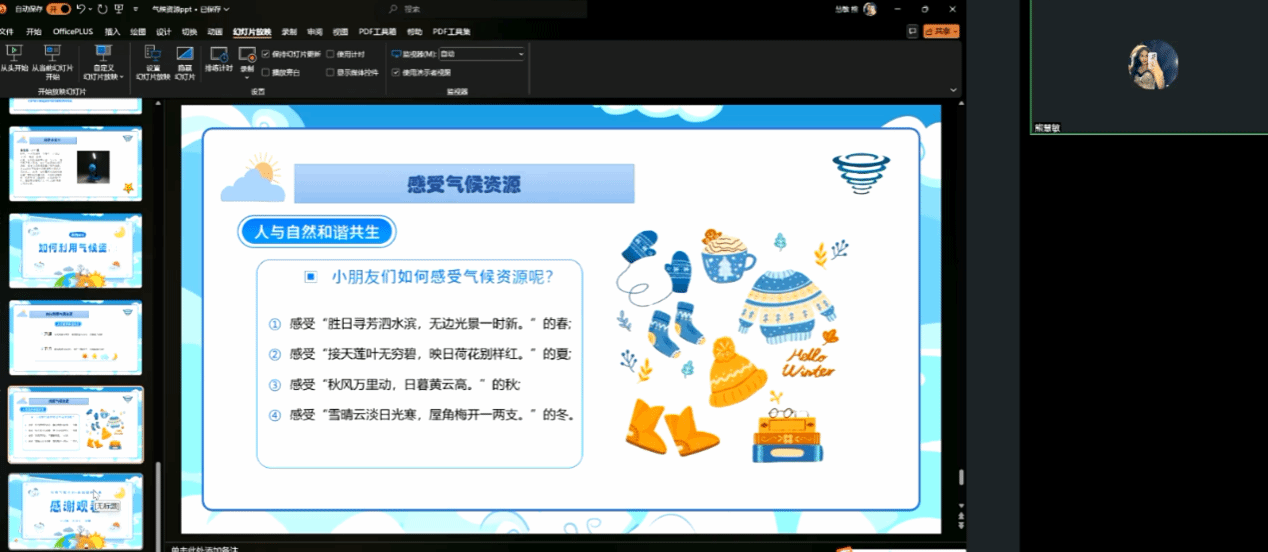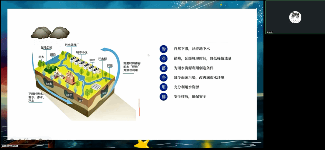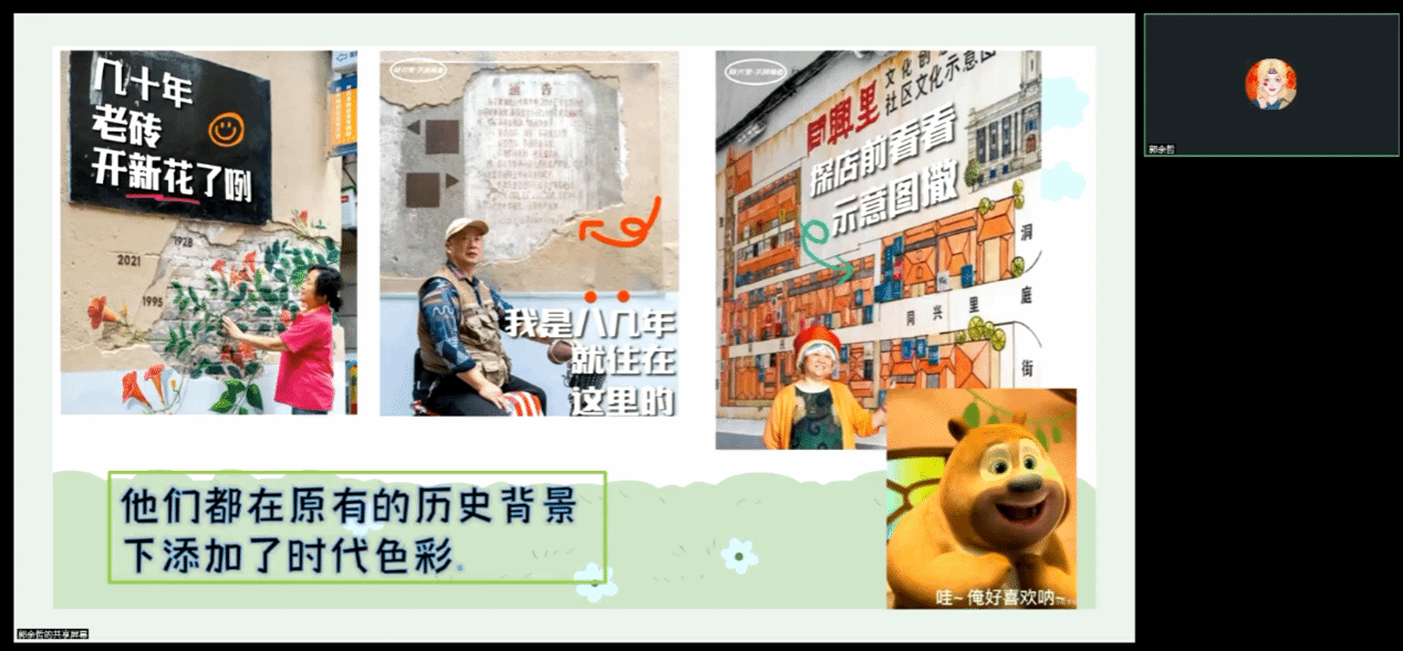 五位学生主讲人依次共享屏幕,分别围绕自己的课程主题进行了深入浅出的讲解。黄雅欣同学以“水资源”为题,详细介绍了水资源是如何在环境中循环利用,并介绍了海绵城市的设计原理以及在生活中的利用,王袁烁同学则以“探索城市用地性质”为题强调了城市用地性质作为城市规划的基石,是确保城市可持续发展和有序运行的关键。熊慧敏介绍了气候资源在农业生产、能源开发、生态保护等方面的重要性,郭余哲就共同缔造在解决社区问题、推动社区发展方面的实际效果展开了介绍,比如,在老旧小区改造、垃圾分类推广、社区文化活动组织等方面,共同缔造都发挥了不可替代的作用,并从五共合作方面设计各类互动环节增强学生对于共同缔造的理解。赵红云以武汉市的历史建筑为切入点,带领大家认识历史建筑,分析不同建筑构造形成的原因、历史建筑的文化价值、保护现状以及未来发展方向。