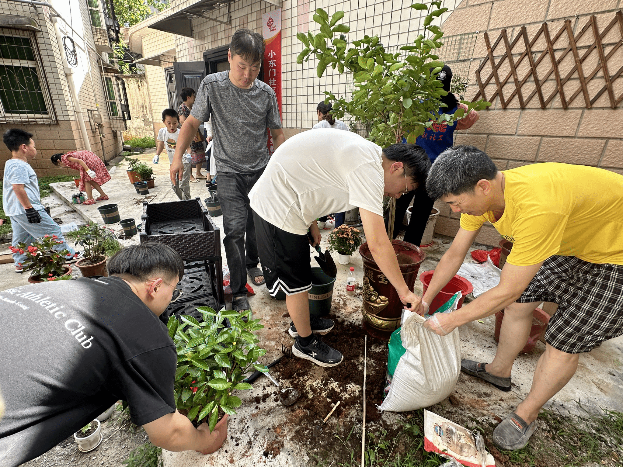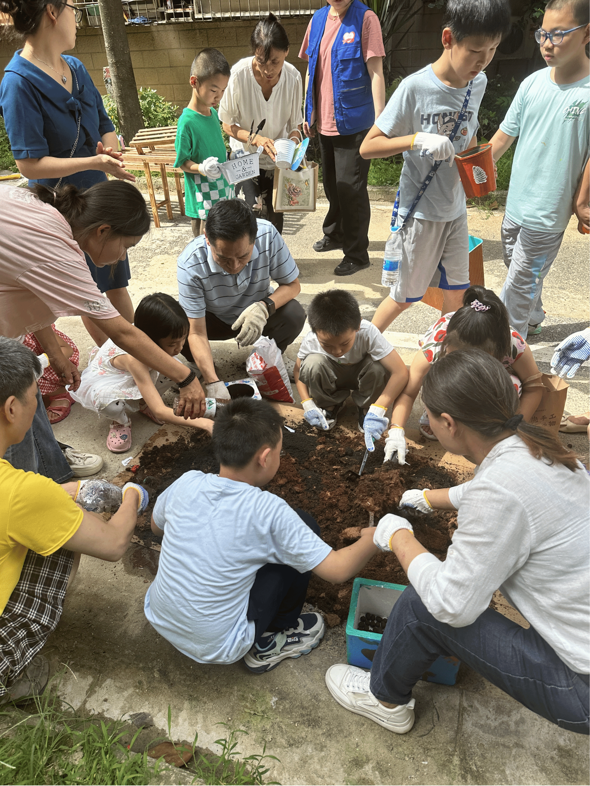 2024年7月20日午后,武汉市小东门社区的共享花园改造活动如火如荼地展开。志愿者和社区家庭们热情高涨,分工明确且协作有序地投入到花园改造工作当中。接着上两次华夏建规工作室精心策划的《小小景观设计师,建设我们的社区共享花园》系列课程,开展第三场共享花园趣打造活动。本次活动由工作室指导老师向添媛牵头,城乡规划22级学生向贻锦,21级学生廖晋方和叶文杰与23级学生赵红云四位学生担任助理,带领社区居民和社工志愿者们共同完成。