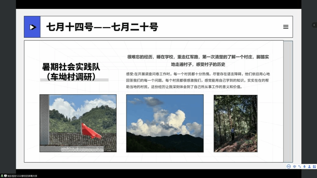 随后由第二位廖优同学依次对其在湖州吴兴区新青年比赛实地调研、暑期社会实践队赴江西吉安车坳村进行村庄调研、社区花园设计、睿抗机器人大赛国赛答辩等方面的活动进行了分享,他的心得感悟主要在得与失两方面,得在于收获颇丰,有了很多次第一次的体验,失在于行程过满,有拖延的习惯导致事情被耽误。感悟在于学习和生活要两方面都要兼顾,要学会给自己放放假,多选择一些符合自己时间安排和感兴趣的任务进行,这样才能提高效率。