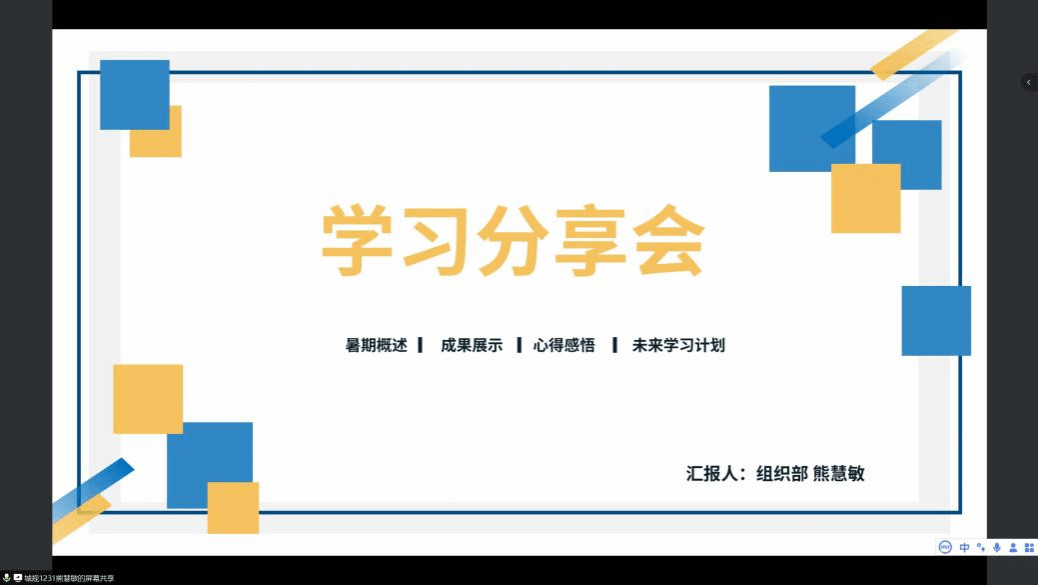 先由第一位熊慧敏同学为大家分享了她在暑假期间参加公益课堂以及两期暑期集训营中PS软件的学习过程,分别从四周的学习感受、成果展示、心得感悟以及未来学习计划等几个方面为大家带来了本周的学习心得。