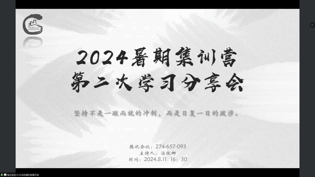 此次活动邀请到五位同学进行学习分享,分别为城乡规划专业23级的熊慧敏同学、22级的廖优、23级郭余哲同学以及21级付京源、陈日裔同学。会议开始,主持人汤依娜对本次暑期集训营打卡情况进行了简述。强调了暑期学习的重要性,同时也希望在接下来的8月份的最后一周学习中同学们可以继续按照自己的步伐进行学习。
