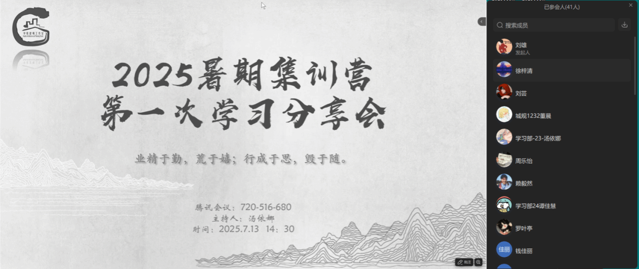 2025年7月13日下午2点半,华夏建规工作室开展了2025年暑期集训营第一期学习分享会。城乡规划系主任、华夏建规工作室负责人张力文、华夏建规工作室指导老师刘雄、向添媛、杨亨和工作室学生成员共41位成员参加会议,会议由学习部23级学生汤依娜主持。