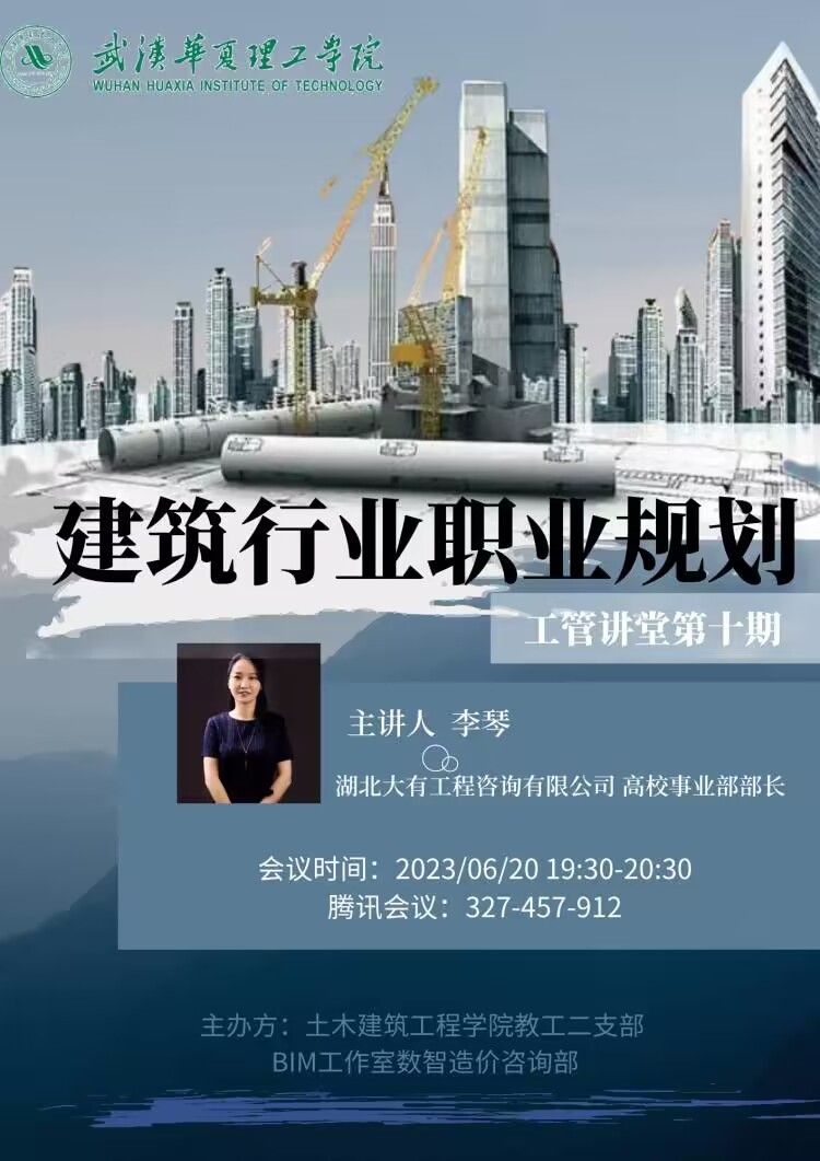 2023年6月20日晚7点半,土木建筑工程学院工管讲堂第十期——《建筑行业职业规划》于腾讯会议正式开讲,本次讲座邀请了湖北大有工程咨询有限公司的高校事务部部长李琴前来分享,吸引了众多对未来就业有顾虑和疑惑的同学们。