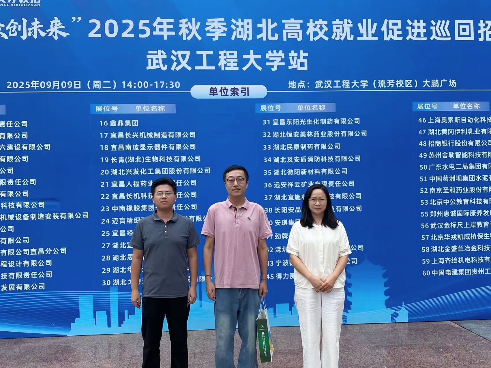 为积极响应学校促进2026届毕业生高质量充分就业的号召,拓宽毕业生就业渠道,2025年9月9日,土木建筑工程学院毕业班辅导员黄呈老师代表学院,与学校学生就业指导服务中心市场拓展办公室主任郝思尧、信息工程学院毕业班辅导员陈远扬一同赴武汉工程大学,参加“汇聚英才 众创未来”2025年秋季湖北高校就业促进巡回招聘会。