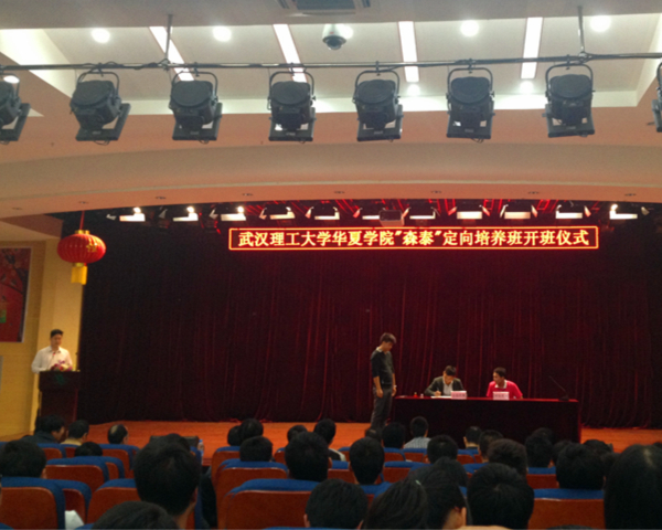 仪式开始,陈伟书记依次介绍了参加会议的领导及公司代表,之后隆重欢迎了森泰集团高层的来访。杨和礼主任首先上台发表演讲,接过话筒后,再次对“森泰”定向班开班表示祝贺及对森泰集团给予华夏学院的大力支持表示感谢。杨主任向大家简单介绍了学院的发展及现状,并解释了开办“森泰”班的意义。接下来,泰森集团工程部经理伍小虎宣读了“森泰”定向班的名单,并向同学们介绍了入班的具体标准。之后,这届“森泰”班学生代表杨成同学上台发表演讲,并表达对学院的感激之情。
