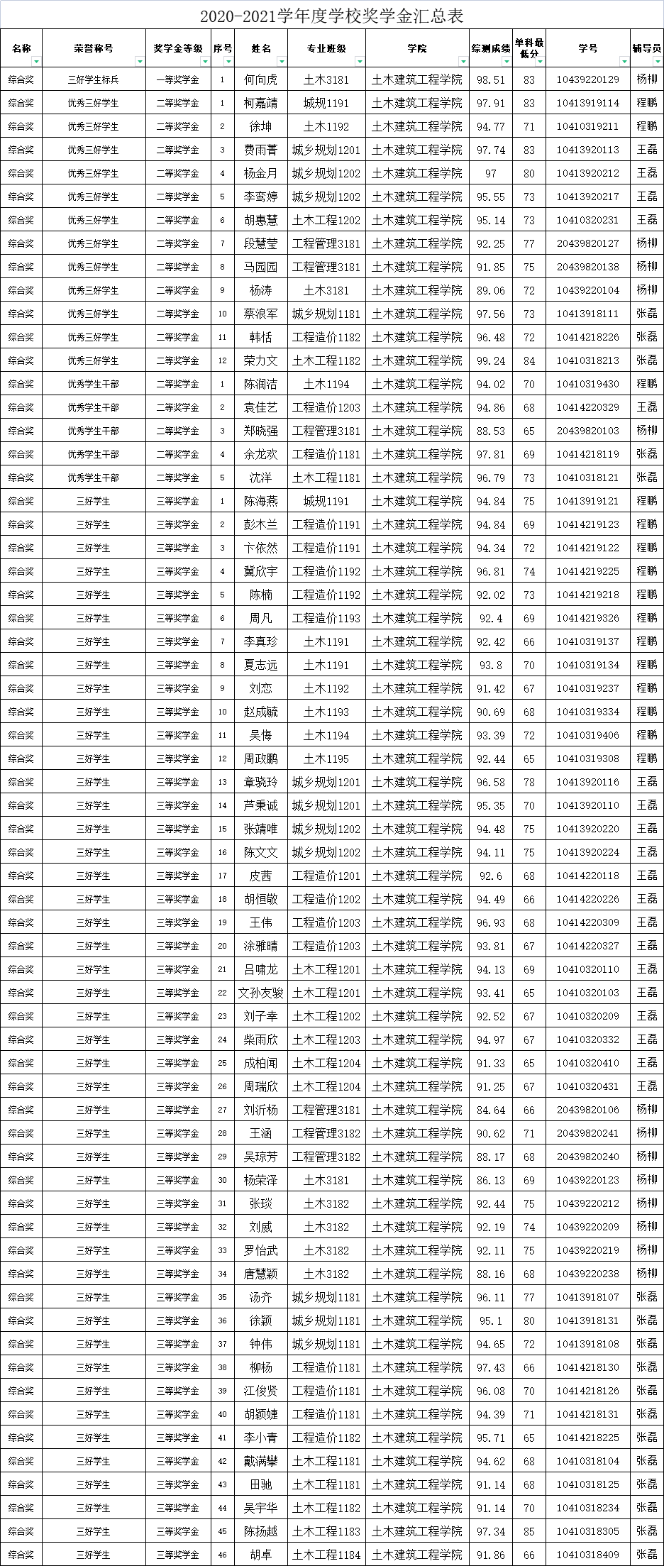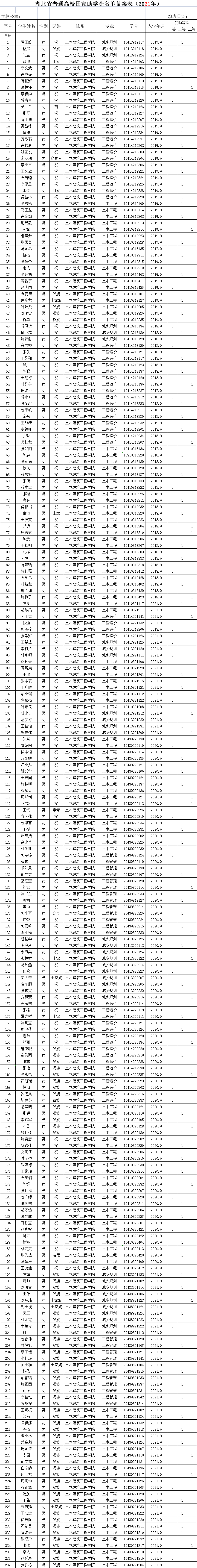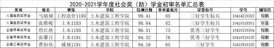 根据学校统一要求,我院2020-2021学年国家励志奖学金、学校和社会奖助学金及2021年国家助学金相关工作已经完成,经学生个人申请,院内各班级严格按照文件相关要求进行评选工作。为进一步确保相关工作公平、公正、公开,现将评选结果公示如下,学院公示时间为2021年11月9日-11日(公示三天),公示期内如有异议者,请来电来访联系土木建筑工程学院。
