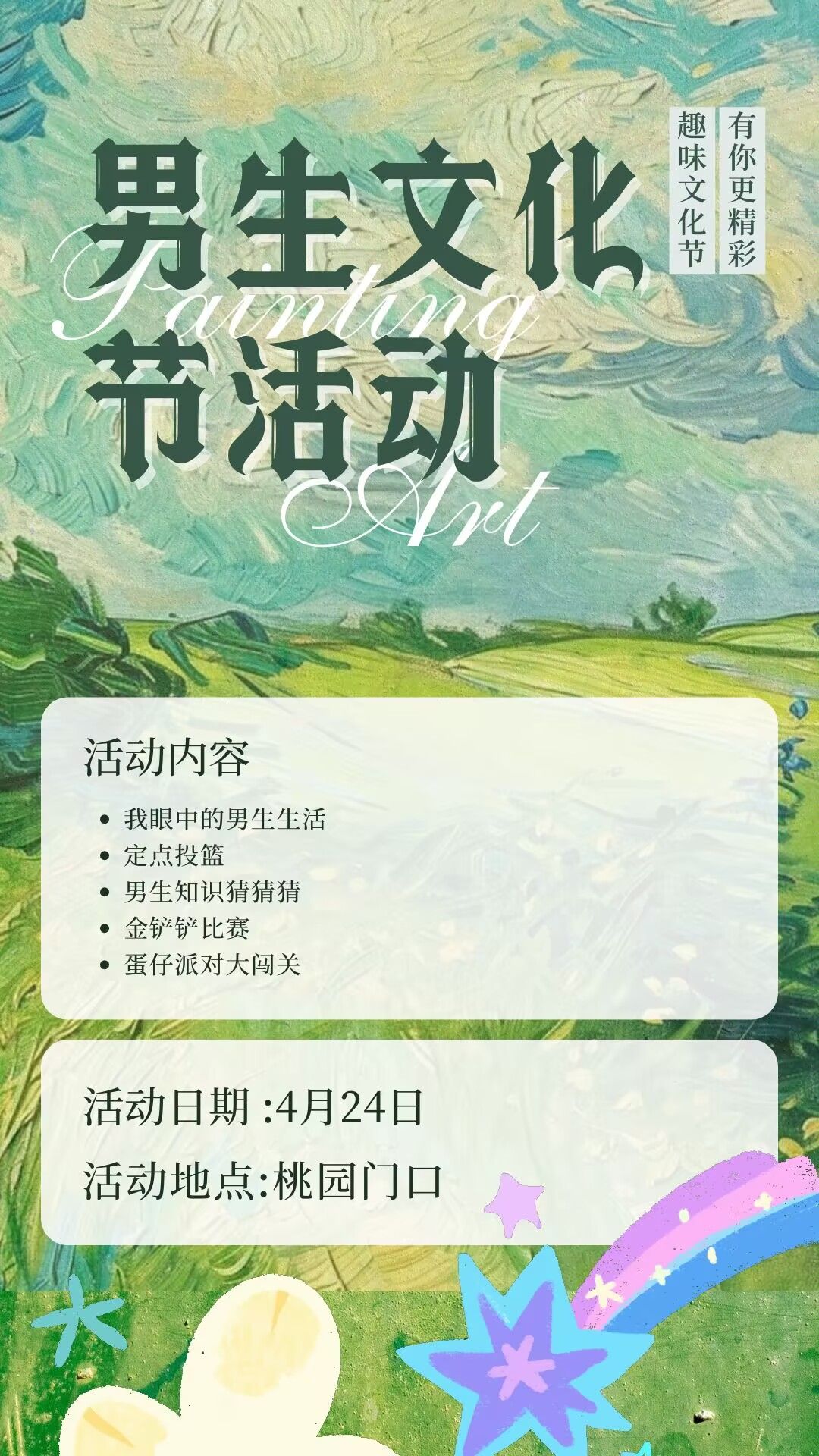 424日,让我们相聚桃园食堂门口对面,共赴这场青春盛宴,在男生文化节中奏响属于我们的心灵乐章,绽放独一无二的青春光彩!