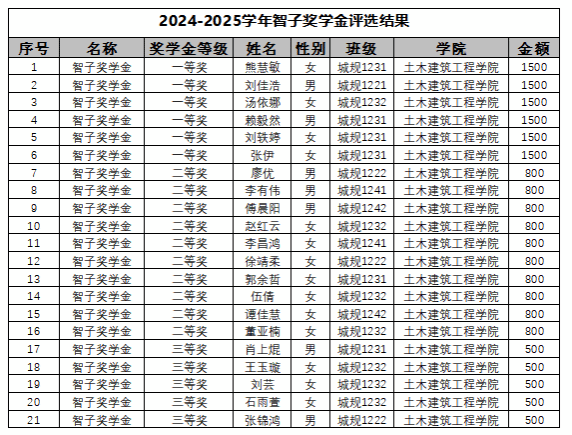 根据《beat365官方网站“智子奖学金”管理办法》文件要求,经学生个人申请,由智子奖学金资助评议小组、各年级辅导员、学院负责人审核,评选出我院2024-2025学年智子奖学金获奖名单,现将评选结果公示如下。