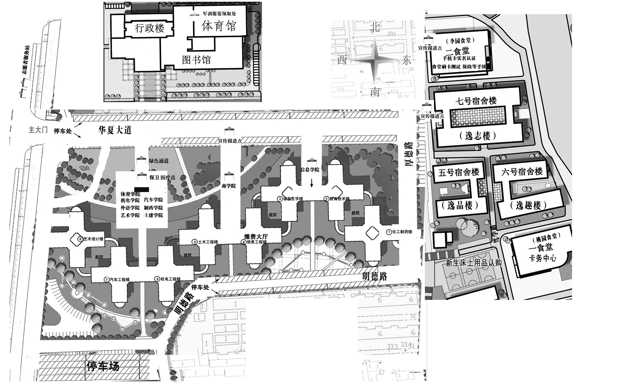 6.其它工作。各学院组织领导、教师到新生宿舍看望新生;宣传中心负责组织迎新广播;后勤保障与保卫处负责大门及道路灯光布置等工作,食堂晚餐供应到22:00,并负责设立迎新报警点和医疗点;提前或推后到校的学生,可到校园卡务中心办理校园卡,一卡通信息与实际情况不符的,由图书馆负责处理;党政办公室负责迎新点的饮水供应,具体安排落实校外迎新工作人员及相应的餐费、电话费补助等;各学院将迎新工作小组及有关人员名单于9月6日前报送党政办公室。
