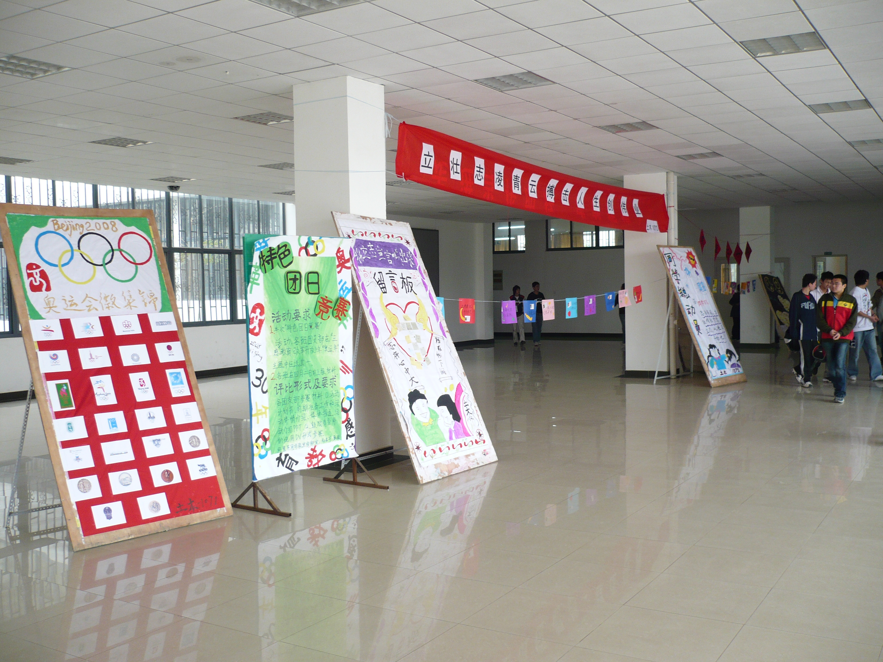 另外,在全班同学的倡议下,我班还开展了以“2008奥运年,好运北京”为标题的横幅签名活动,同时将历届奥运会会徽以宣传海报的形式展现出来,尽显奥运风采。同学们踊跃签名,现场气氛十分活跃。
