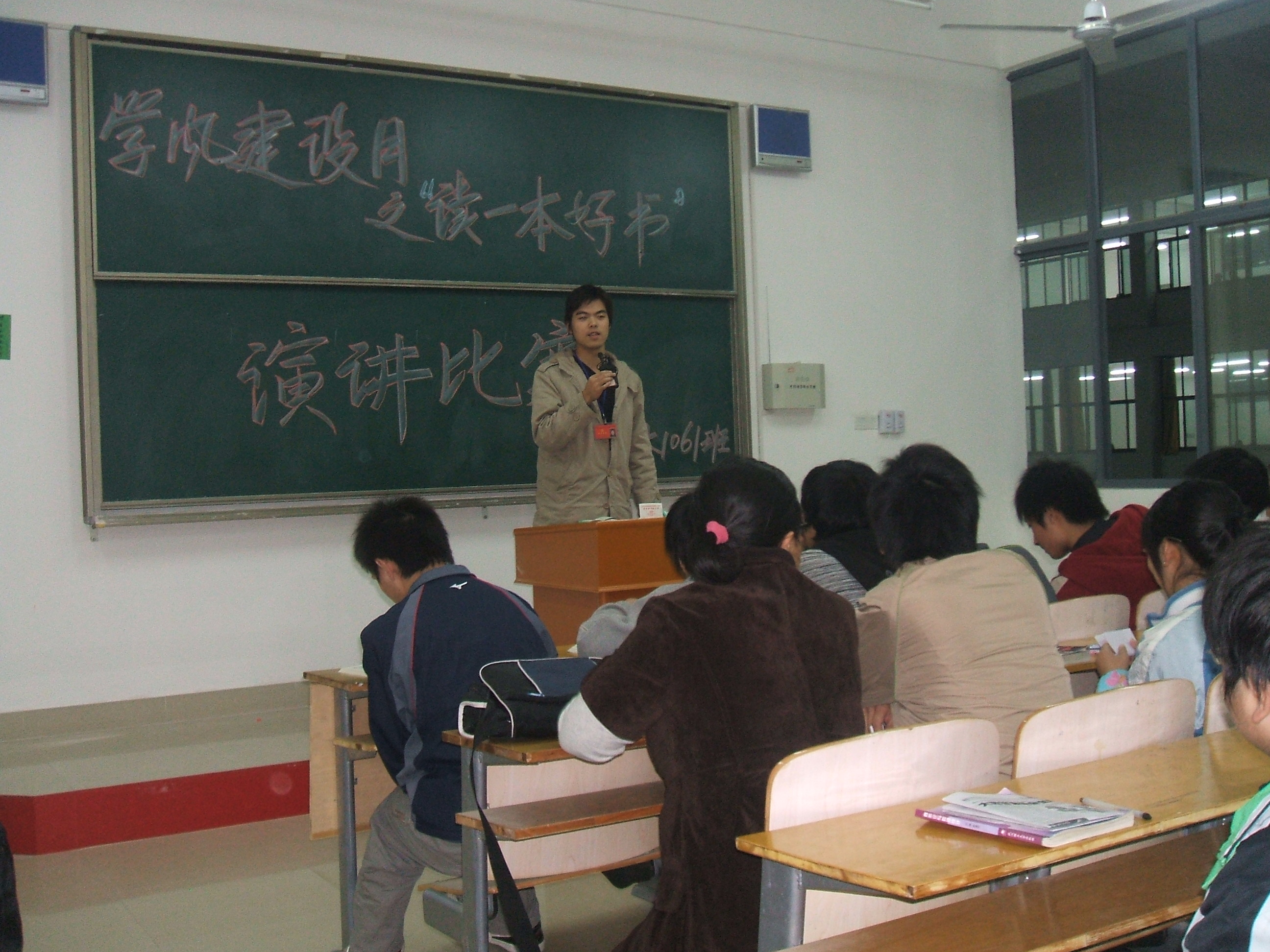 为了响应学校学风建设月的号召,11月22日晚上7:00,我系土木1061班举办了学风建设月之"读一本好书"演讲比赛。我们有幸请到了系学生会主席张劲松和副主席李念同学担任此次活动的嘉宾,还有兄弟班级的多名同学前来捧场。