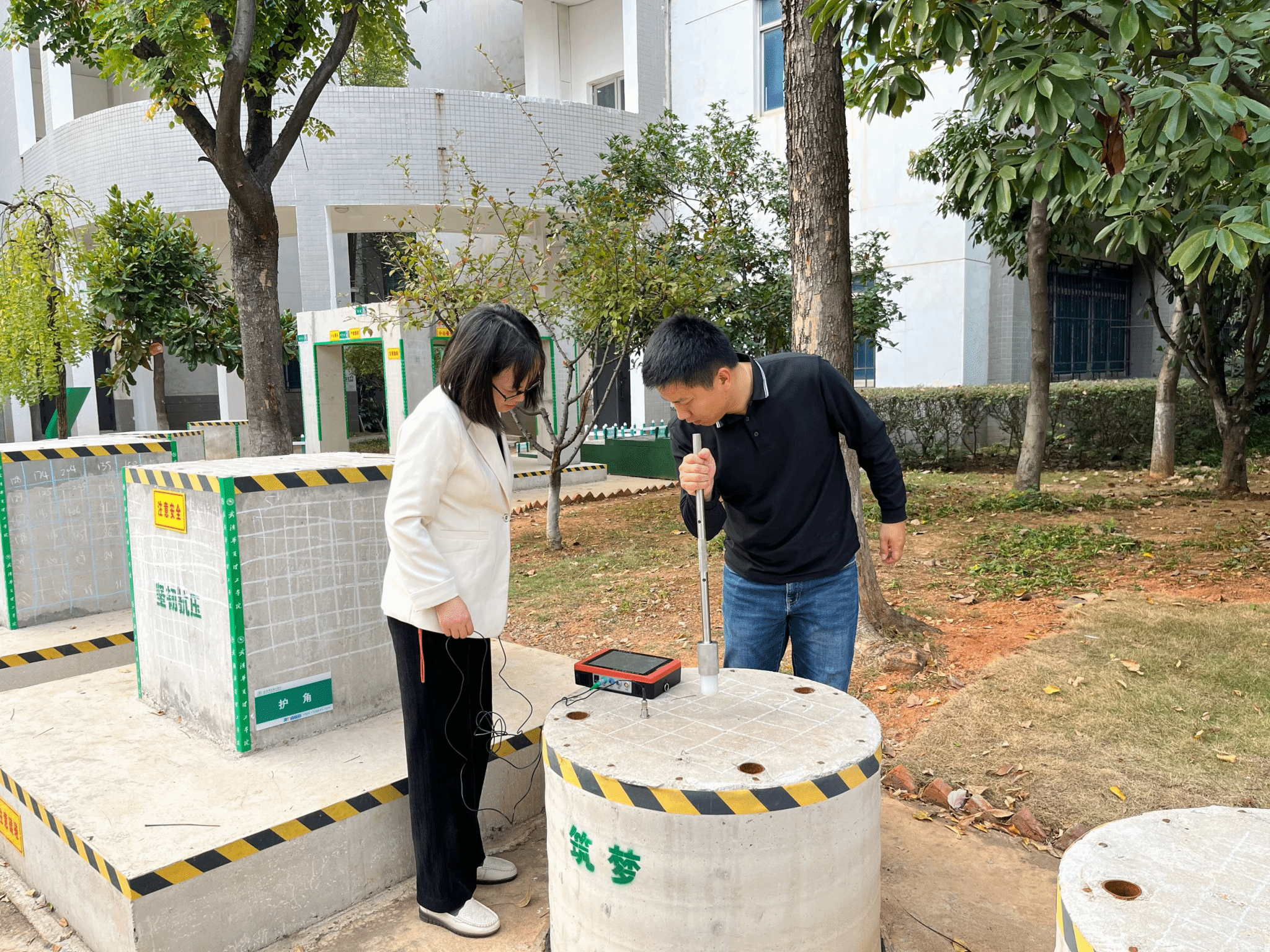 2024年11月14日下午,土木系兼职教师苏明会,实验中心教师李亚峰、周静在我院实验中心建筑公园内,对于《基础工程》课程实验低应变桩基检测试验进行了探讨和交流。不仅对暑期新建的建筑公园模型桩进行了实地检测,还就检测结果进行了深入的讨论与分析。
