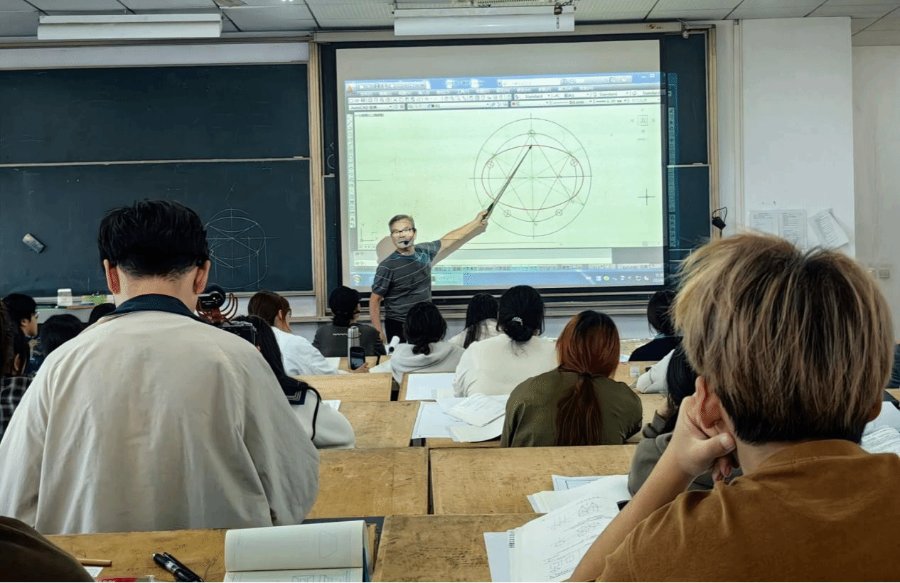 随后,密教授通过PPT演示的方式,从团徽的基本构成要素出发,复习每个部分的绘制步骤,再讲解演示轴测图的画法,采用现场提问的教学方式,并保持一个较好的教学进度,确保每位同学都能跟上节奏并理解关键点。
