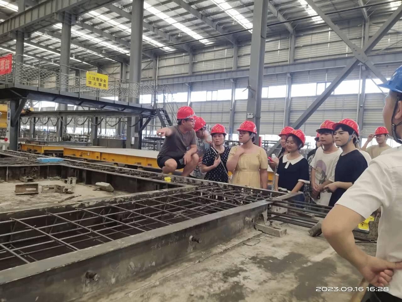 在企业工程师的引导下,师生们参观了预制构件的钢筋骨架绑扎、构件浇筑、养护和堆放等生产工艺流程。工程师着重讲解了各生产环节中的技术要点,耐心解答了师生们提出的问题。