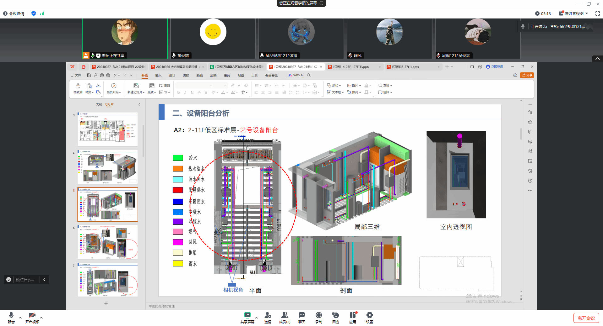 张旭首先就其负责的二号楼低区(2-11F及12F)设备阳台设计方案进行了详细汇报,展示了精心制作的平面图、剖面图、室内透视图及局部三维模型,并就设计思路、技术难点及解决方案进行了深入阐述。紧接着,吴俊杰分享了高区(29-35F、36F及37F)的设计成果,特别强调了高层设备阳台设计需考虑的特殊因素,如风压、视野及安全规范等,并展示了相应的设计图纸与模型。最后,黄俊喆本人汇报了高区(14F-26F及27F)的设计方案,他结合个人专业知识与团队讨论成果,提出了一系列创新性的设计思路,得到了与会人员的广泛认可。