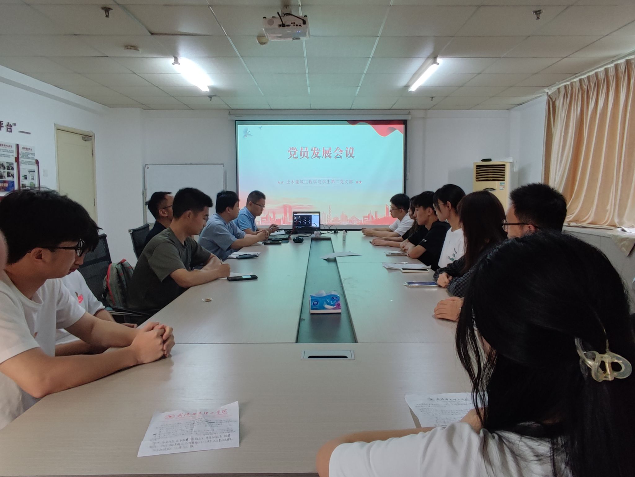 2023年6月13日下午5点40分,土木建筑工程学院学生二支部在综合楼1021会议室召开党员发展会议,讨论接收孙采田等8名同学为预备党员事宜。商学院党总支组织员杨柳、学院党总支组织员吴振琦、学生二支部纪检委员严志良和支部全体学生党员参加,会议由支部书记黄开甲主持。