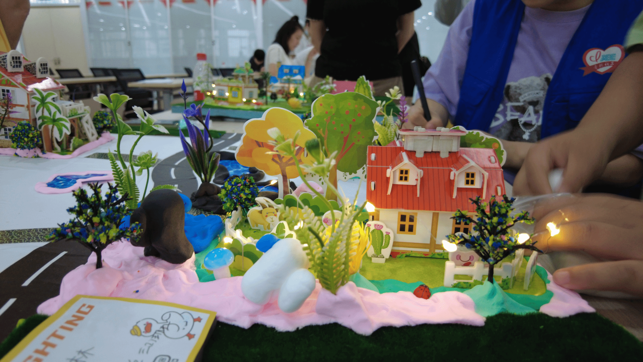 本次课程内容分为前情回顾、知识拓展、沙盘制作与成果展示四个环节。汤梦婷先进行了课程衔接,回顾了第一节课所学内容,然后从口袋公园的定义、特征与功能进行更加详细的介绍,从中了解到“小规划师”心目中的所向往的口袋公园。对下一项协作共创沙盘材料与其中配景的制作流程进行说明。在沙盘制作环节,“小规划师”自主选择自己喜欢的建筑模型进行拼接,有的是住宅、有的是商店、有的是卫生站点,所选内容涵盖了十五分钟生活圈所需设施服务点,然后助教老师发放教具,“小规划师”对自己的房屋进行拼装,制作配景草皮、树木、水池、与小动物等,来完善自己的沙盘社区,助教老师还对“小规划师”较难制作的配景进行了教学,如街边道路树木的制作,草坪的铺装。这些与“小规划师”息息相关的生活场景和社区风景,都被生动地呈现在了沙盘之上,不仅体现了社区完整更添加欢乐童趣的色彩。最后让“小规划师”给自己的小屋写上名字,“小规划师”与自己的作品进行合照。