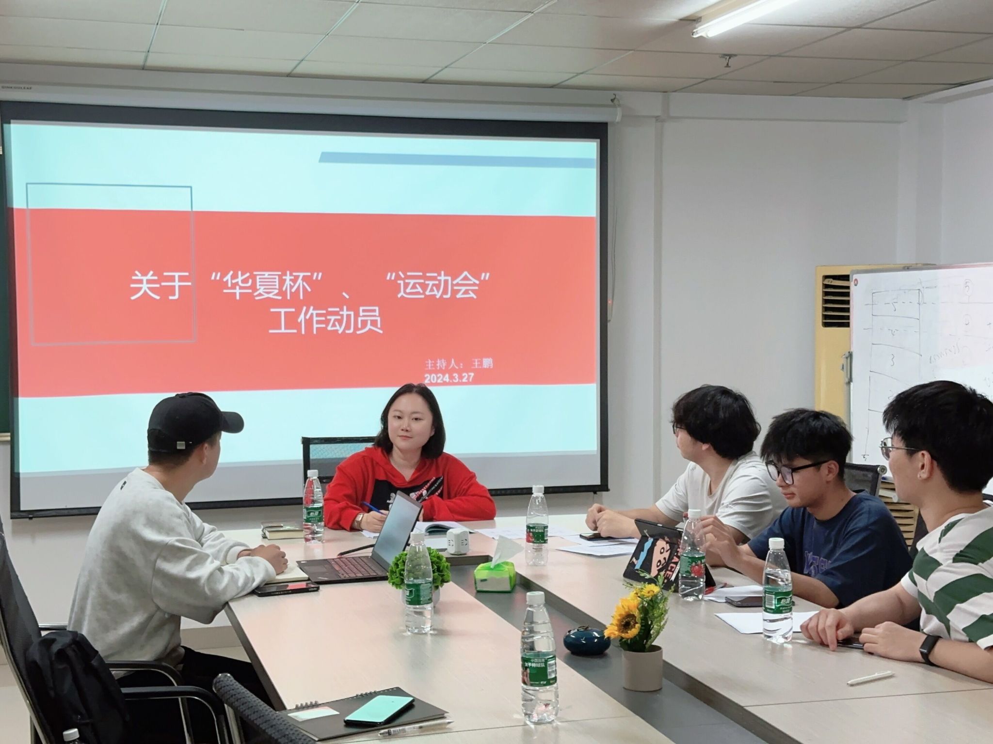 随后,她对华夏杯的具体工作进行了详细部署。他要求各部门按照赛事安排,提前做好场地布置、赛程规划、裁判选拔等工作,确保比赛公平、公正、公开。同时,他还强调了赛事安全的重要性,要求相关部门加强安全保障措施,确保比赛期间的安全稳定。接着就运动会的工作进行了部署。昌老师提出,运动会作为学校的一项重要活动,不仅是对学生体育水平的检验,更是展示学校精神风貌的重要平台。他要求各部门加强协调配合,确保运动会各项工作的顺利进行。同时,他还提出了丰富运动会活动内容、创新活动形式的建议,以吸引更多同学积极参与。