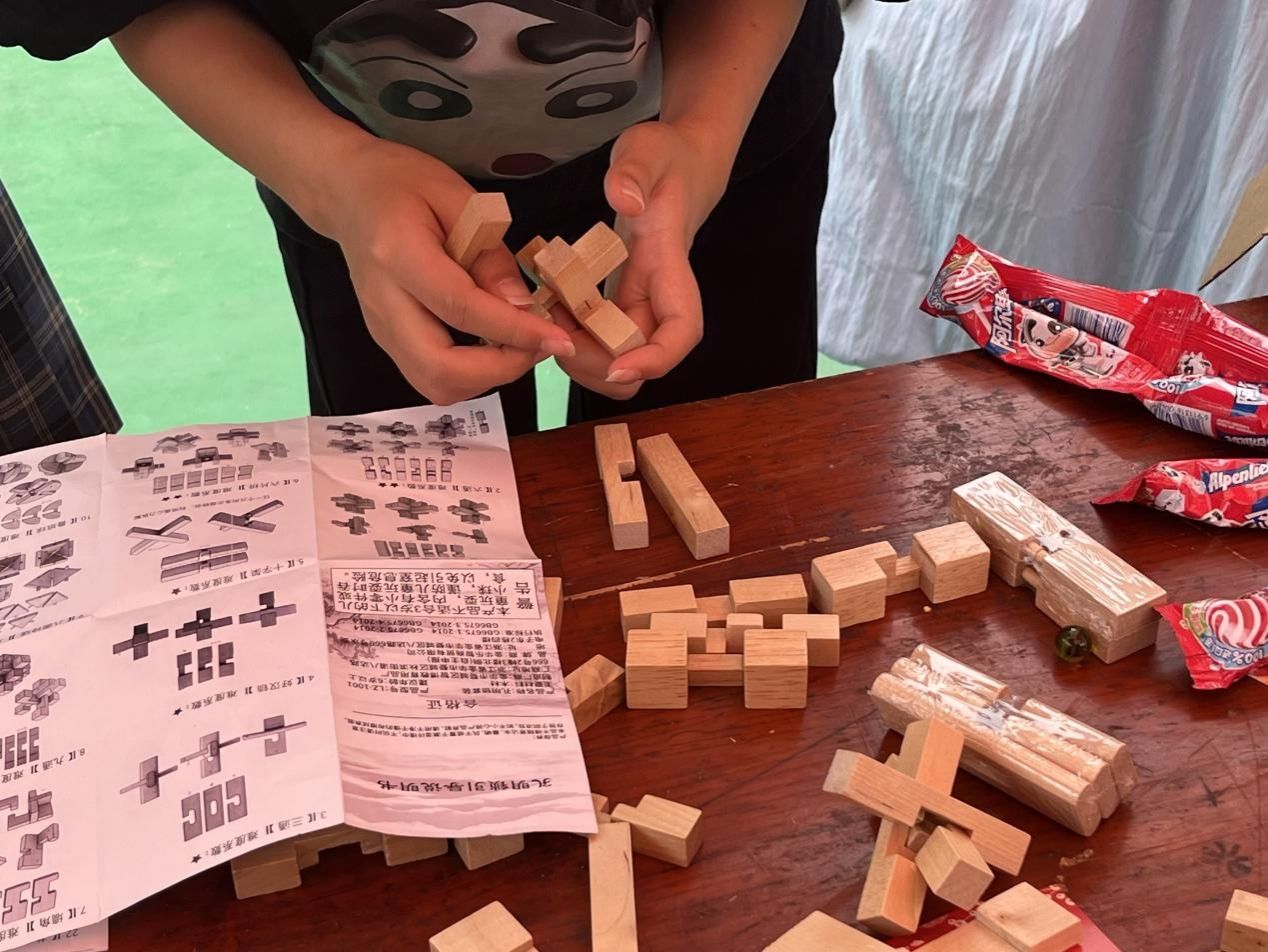 与之相邻的“拼解鲁班锁”游戏则更考验同学们的耐心与智慧。鲁班锁,这一古老的智力玩具,蕴含着精妙的榫卯结构。同学们拿到鲁班锁后,仔细端详,尝试着不同的拼接和拆解方法。