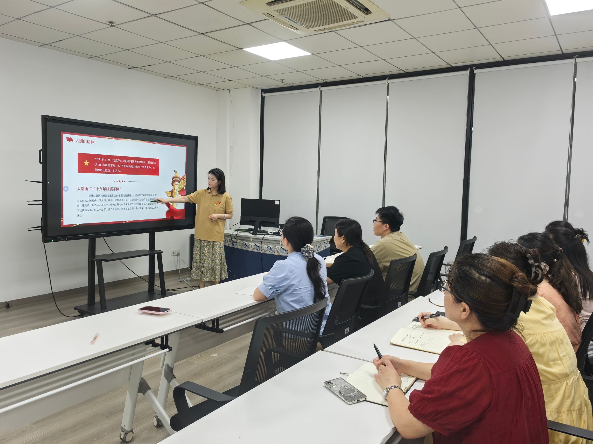 活动中,支部书记张城芳深入讲解了大别山精神“坚守信念、胸怀全局、团结奋进、勇当前锋”的核心内涵,并结合实际,号召全体党员以革命精神推动工作创新。在交流环节,李静老师结合教学实践发言:“学习大别山精神后,我在课堂上增设红色故事模块,用革命先辈的事迹激励学生,效果显著。”,朱红玉老师分享道:“我将大别山精神融入班级管理,引导学生树立集体意识,班级凝聚力明显提升。最后张书记强调,全体党员干部要以大别山精神为指引,立足岗位作贡献,切实把学习成果转化为推动为高质量教学的实际行动。