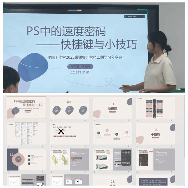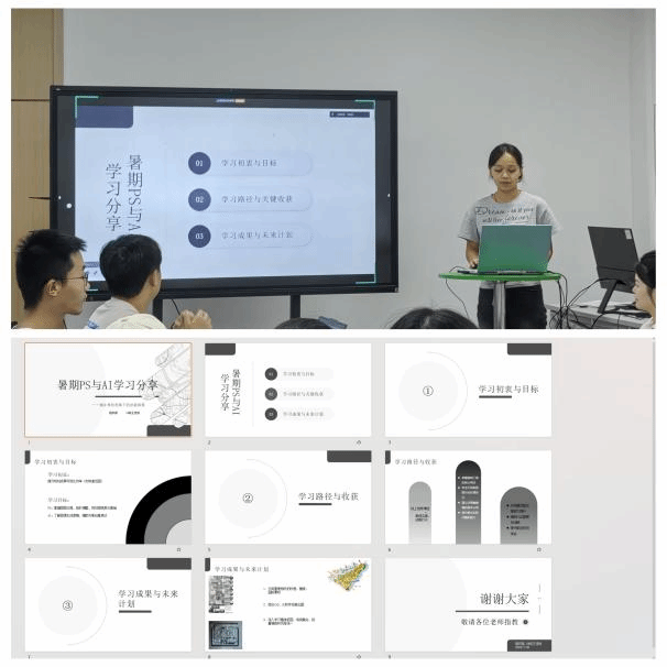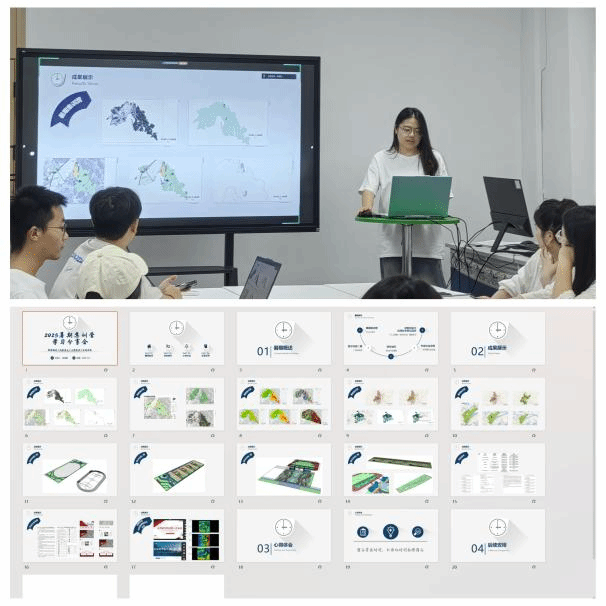 24级傅晨阳同学在分享了彩平图、交通流线分析图、区位分析图等核心表达技法,成功将复杂的空间关系转化为直观视觉语言的同时,通过PS、AI等软件的系统学习及对“城市肌理”等概念的深刻探讨,明确了假期个人提升与“数字校园”、“韧性城市”等项目的跟进计划,为未来实践打下坚实基础。