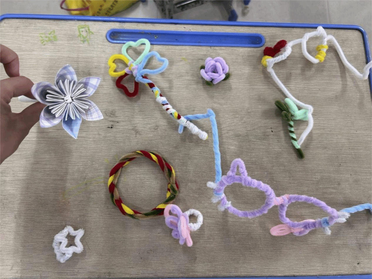 下一节扭扭棒课同样精彩纷呈。王玉璇老师为孩子们准备了五颜六色的扭扭棒,从简单的小动物造型到创意十足的花朵、手环,她手把手教大家弯折、缠绕。孩子们发挥想象,将普通的扭扭棒变成了一个个灵动的小作品,互相展示着自己的“成果”,课堂上充满了成就感与欢声笑语。