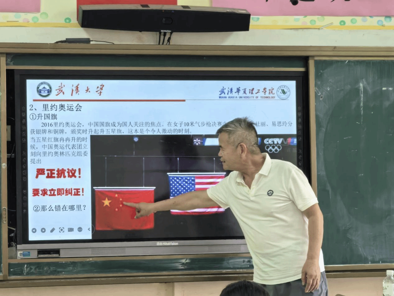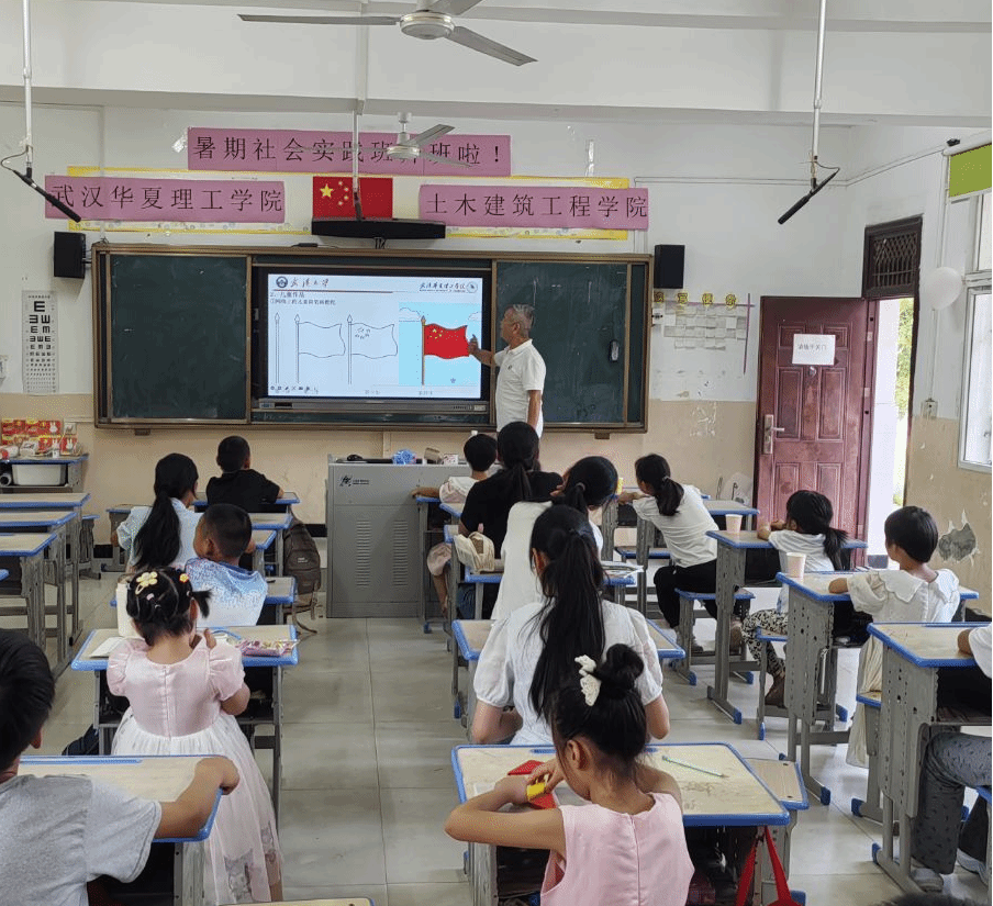 密新武老师作为土木建筑工程学院责任教授,不仅拥有深厚的教学积淀,更兼具丰富的行业影响力——他曾任武汉大学城市设计学院教学实验中心主任,同时担任第六届中国图学会常务理事、第十届湖北省工程图学学会理事长,长期致力于工程图学教学工作。课堂上,他以生动的语言梳理五星红旗的历史脉络,从设计理念到象征意义,将家国情怀融入知识点,让孩子们在聆听中感受国旗的庄严与厚重。