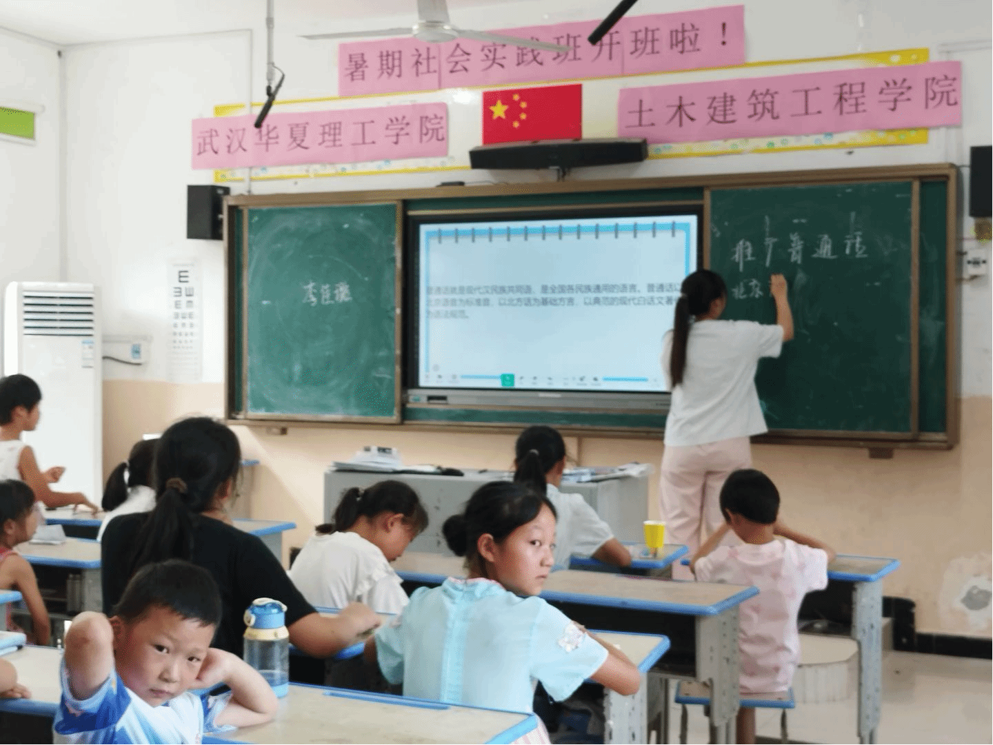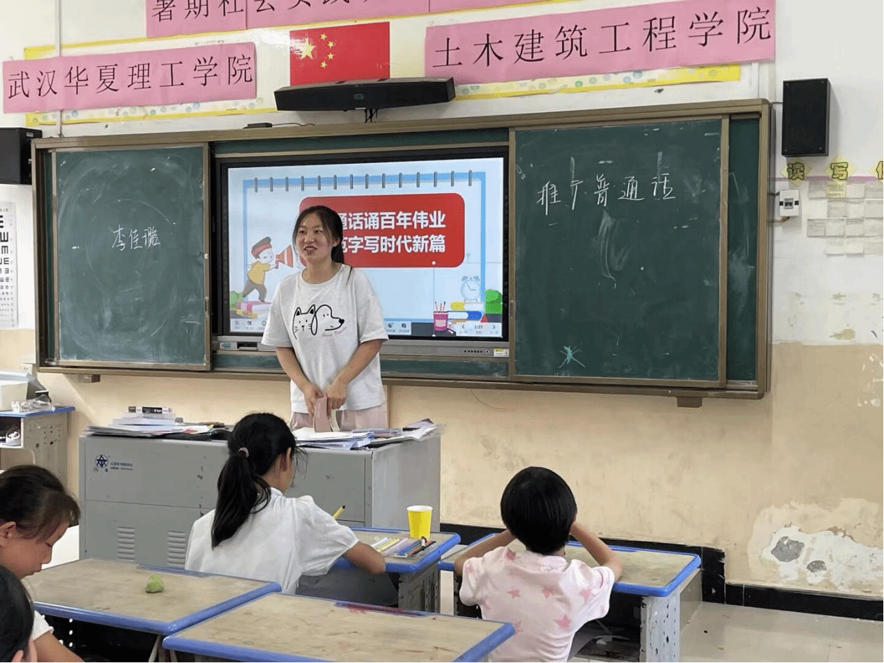 七月的阳光透过教室的窗户,洒在一张张稚嫩的脸庞上。"老师,普通话是怎么来的呀?什么是普通话呀?"清脆的童音在教室里回荡。这是beat365官方网站土木建筑工程学院"普润乡村·青春发声"实践队在龙山镇彭家沟小学开展推普课堂的生动一幕。实践队员李佳璐正与孩子们用普通话互动,共同谱写着一曲温暖的教育乐章。