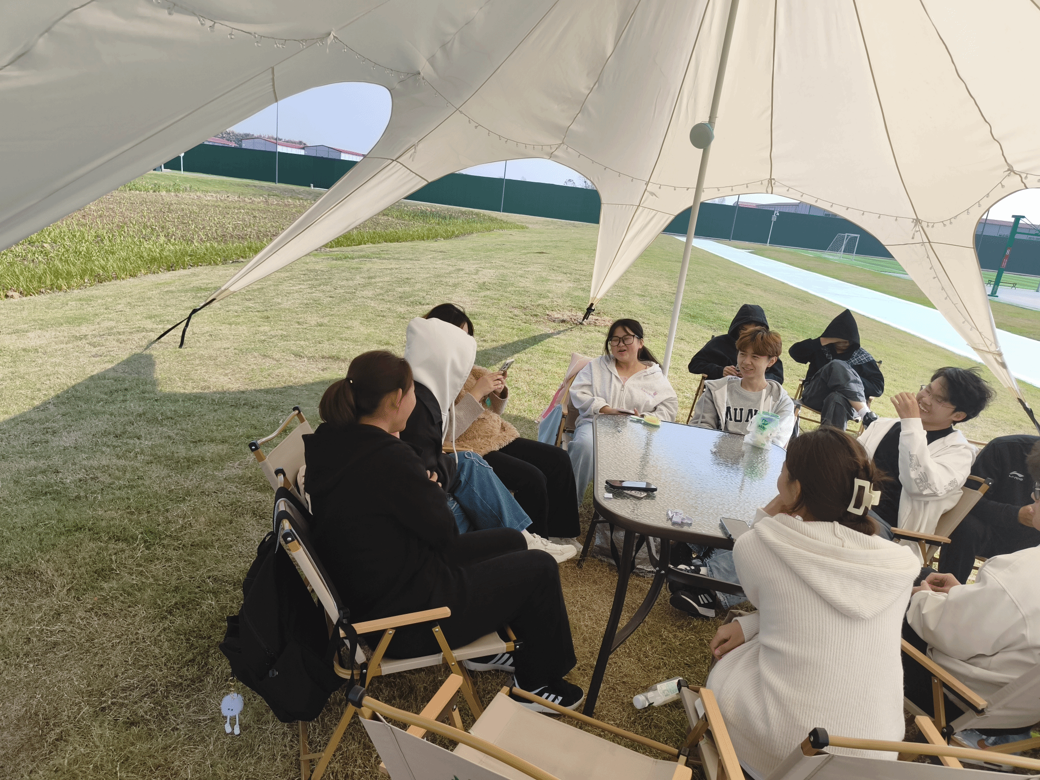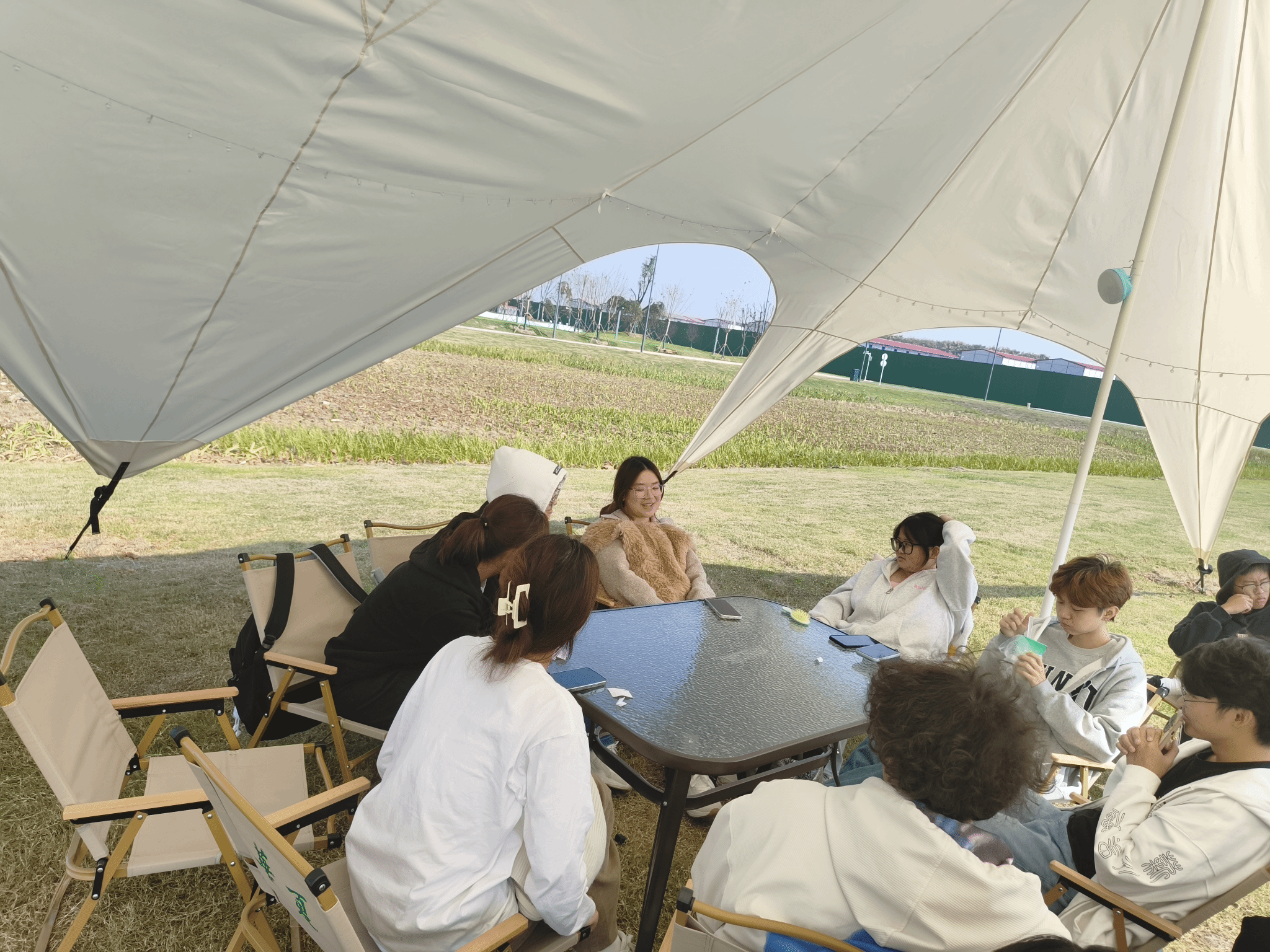 活动在环境优美的户外天幕举行。白色的帐篷下,同学们围坐在圆桌旁,绿意盎然的草地与远处开阔的景致为活动提供了轻松愉悦的自然氛围。随着游戏开始,现场迅速沉浸于紧张而欢快的气氛中。同学们角色代入感极强,无论是作为“狼人”暗中潜伏、巧妙伪装,还是作为“村民”和“神职”细致推理、激烈辩论,每个人都全情投入。时而因一句精妙的发言引发会心大笑,时而为一场成功的推理报以热烈掌声,智慧的火花在交流碰撞中不断闪现。