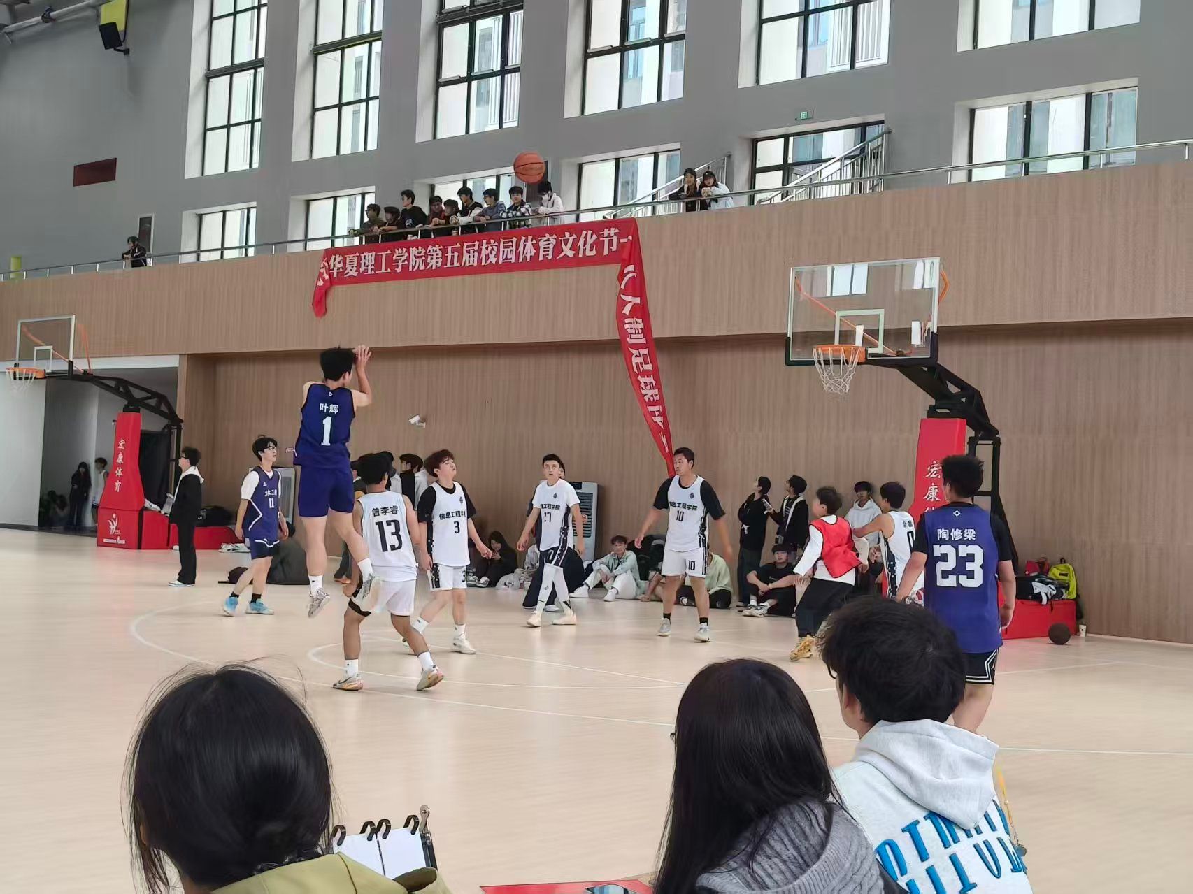 比赛开场,我院迅速进入竞技状态,依托内线球员的身高优势与快速反击战术,率先撕开对手防线,短时间内建立起进攻优势,一度掌控场上节奏。面对暂时落后的局面,信息学院并未慌乱,教练及时暂停调整战术,球员们迅速适应节奏,通过严密的防守逼抢制造对手失误,同时借助外线精准投射与灵活的突破分球,逐步缩小分差,首节结束时双方比分紧咬,悬念十足。