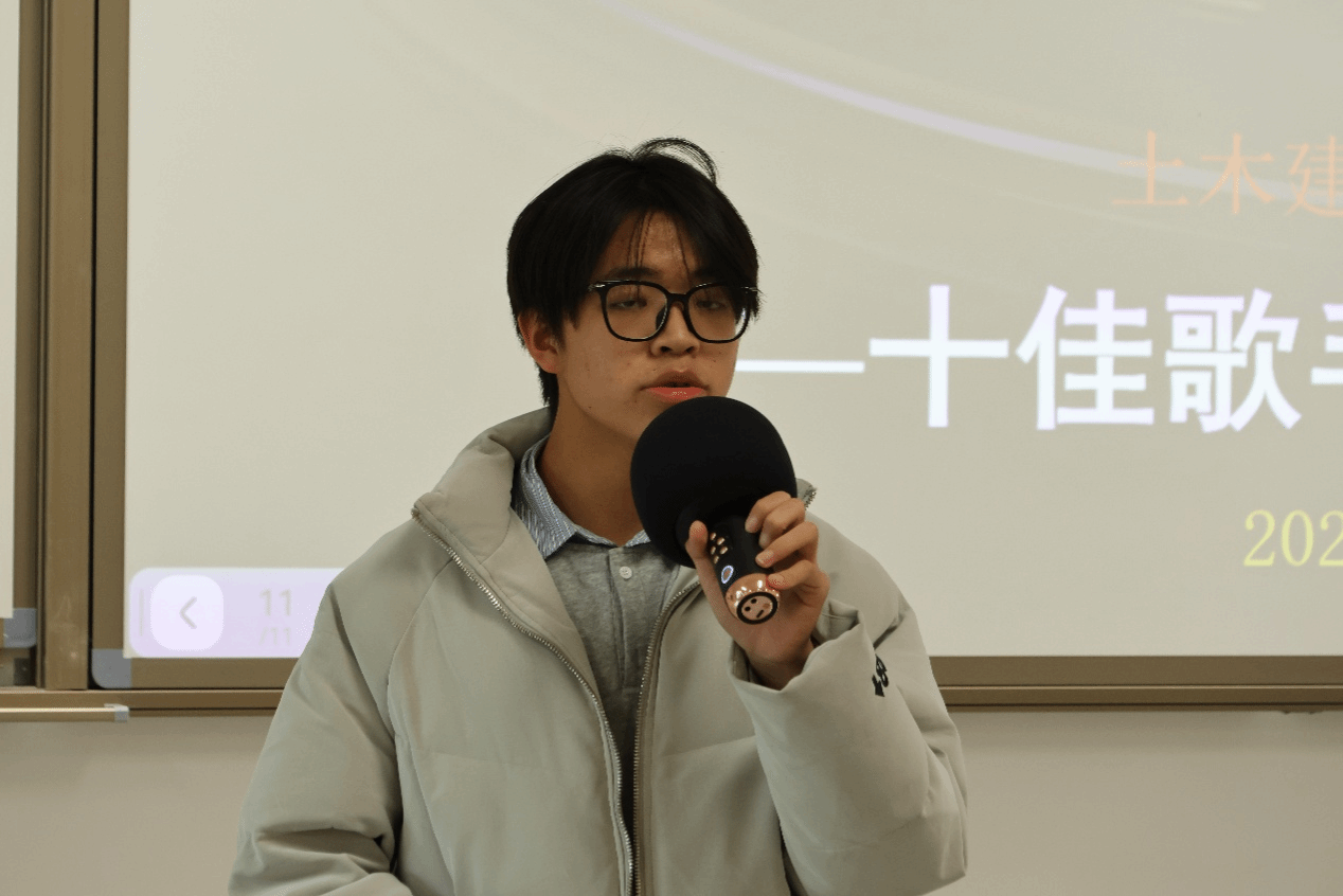 本次大赛自启动以来,吸引了学院各年级同学踊跃参与,经过初赛、复赛的层层选拔,十位选手脱颖而出站上决赛舞台。决赛现场,选手们风格各异:有人以一曲《勋章》唱出青春里不服输的韧劲,歌声里藏着土木人“攻坚克难”的精神底色;也有人用《最长的电影》的温柔旋律,诠释着学科之外的细腻情感;还有《冬眠》的舒缓节奏,让现场沉浸在治愈氛围中。
