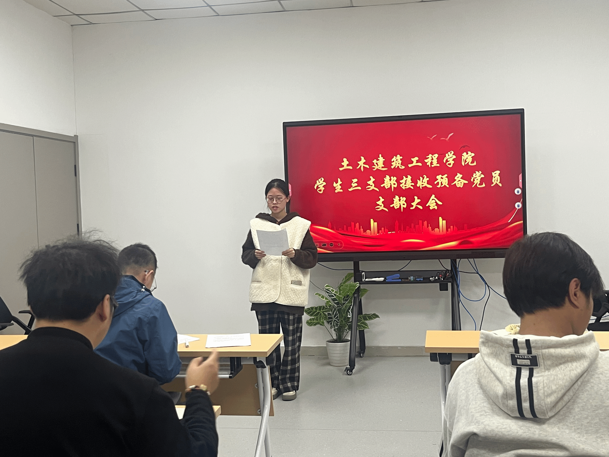 2025年11月25日中午12:30,土木建筑工程学院学生第三支部于综合楼会议室(四)进行接收预备党员会议,本次活动由学生第三党支部书记程鹏同志主持,院党总支副书记徐双立同志出席并指导,支部党员徐靖柔、刘轶婷、刘佳浩、周怡欣、赵柯瑜、王家乐、吴洪亮、王俊曦等人参加。此次大会审议接收金晶同志为预备党员的申请。