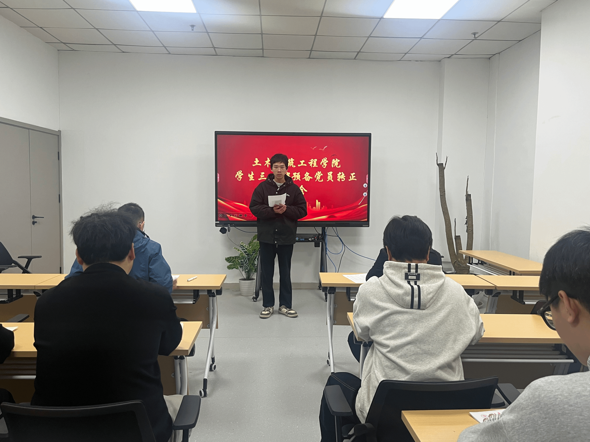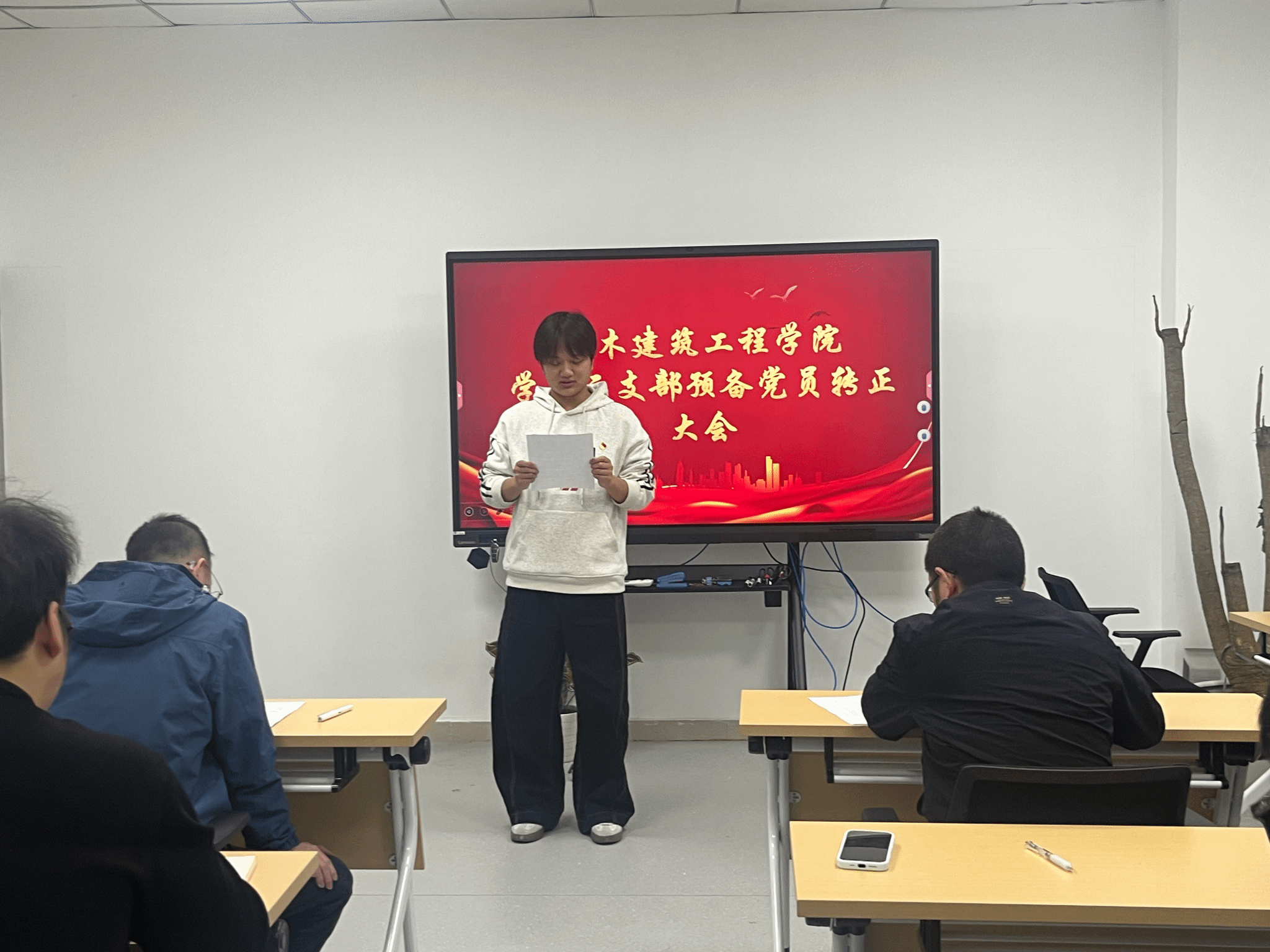 2025年11月26日中午12时45分,土木建筑工程学院学生第三支部在综合楼会议室(四)召开预备党员转正大会,审议王家乐、吴洪亮两位同志转为正式中共党员的申请。会议由学生第三党支部书记程鹏同志主持,院党总支副书记徐双立同志出席指导,支部党员徐靖柔、刘轶婷、刘佳浩、周怡欣、赵柯瑜、王家乐、吴洪亮、王俊曦等人参加。此次大会旨在审议王家乐与吴洪亮两位同志为正式中共党员的申请。