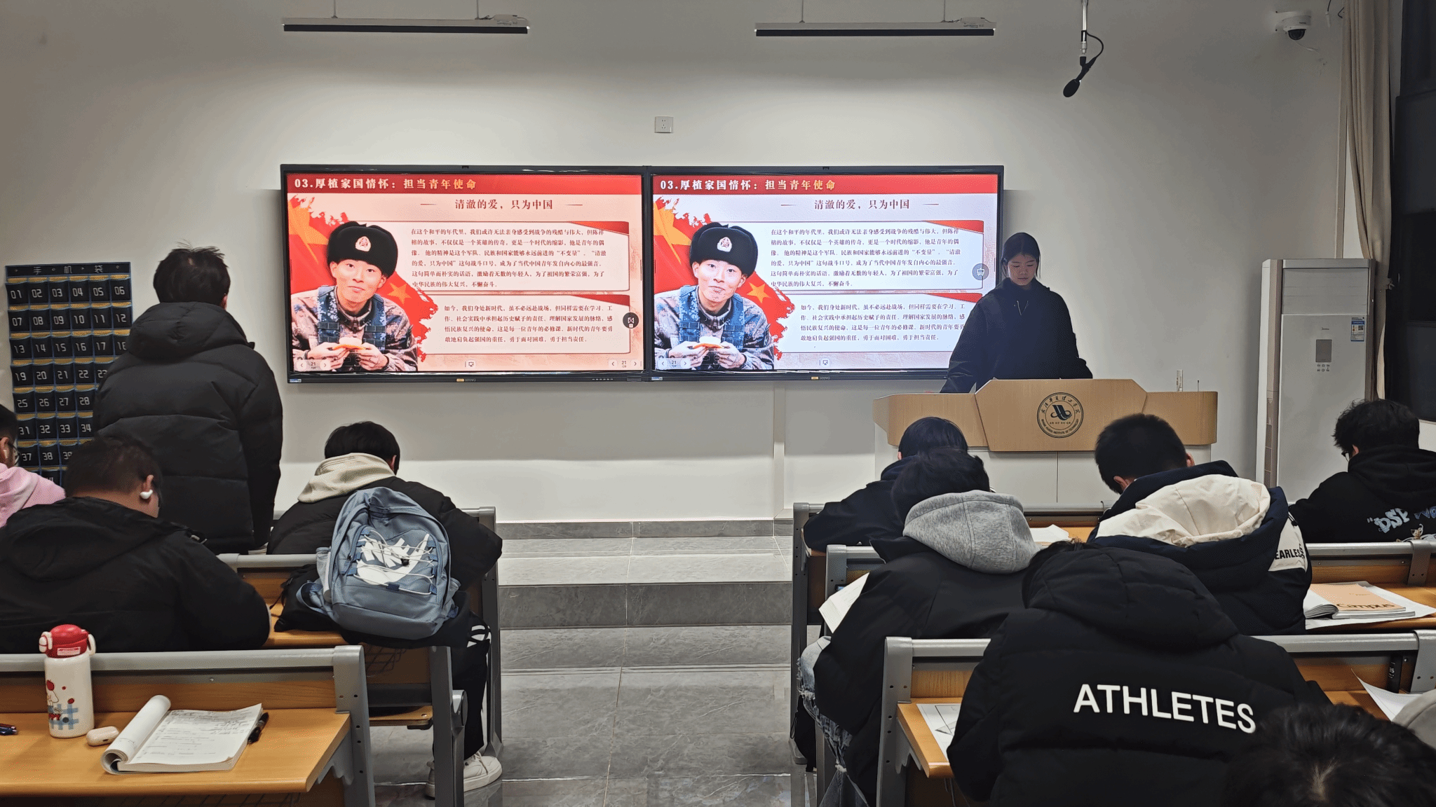 紧接着,陈祥榕“清澈的爱,只为中国”的誓言,让教室静了下来。许一朵把“使命”落在土木专业的日常里:“我们不用奔赴战场,但能做校园志愿的‘小红’、测绘实践的‘尖兵’——就像班级之前的义务测绘,每一笔线条都是‘担当’的注脚。”