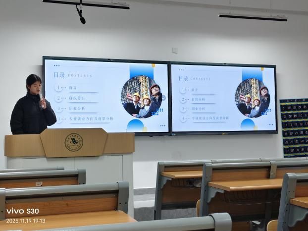 大赛以“筑梦土木行远路,规划青春赴新程”为主题,延续“成长赛道”与“就业赛道”双轨设置,适配不同年级学生发展需求。参赛选手紧扣土木建筑行业“智能建造”“绿色建筑”“城市更新”等发展趋势,通过PPT展示与现场陈述,从自我认知、行业调研、目标设定、实施路径等方面,系统呈现个人职业规划蓝图。成长赛道选手聚焦长期发展,勾勒出从技术专员到项目管理专家、建筑设计总监的进阶路径;就业赛道选手精准对接岗位需求,围绕BIM工程师、结构设计师、工程咨询顾问等热门方向,展示专业技能储备与求职实践成果,部分选手分享了参与校园基建项目、企业实习的实操经历,展现出扎实的专业素养与清晰的职业认知。