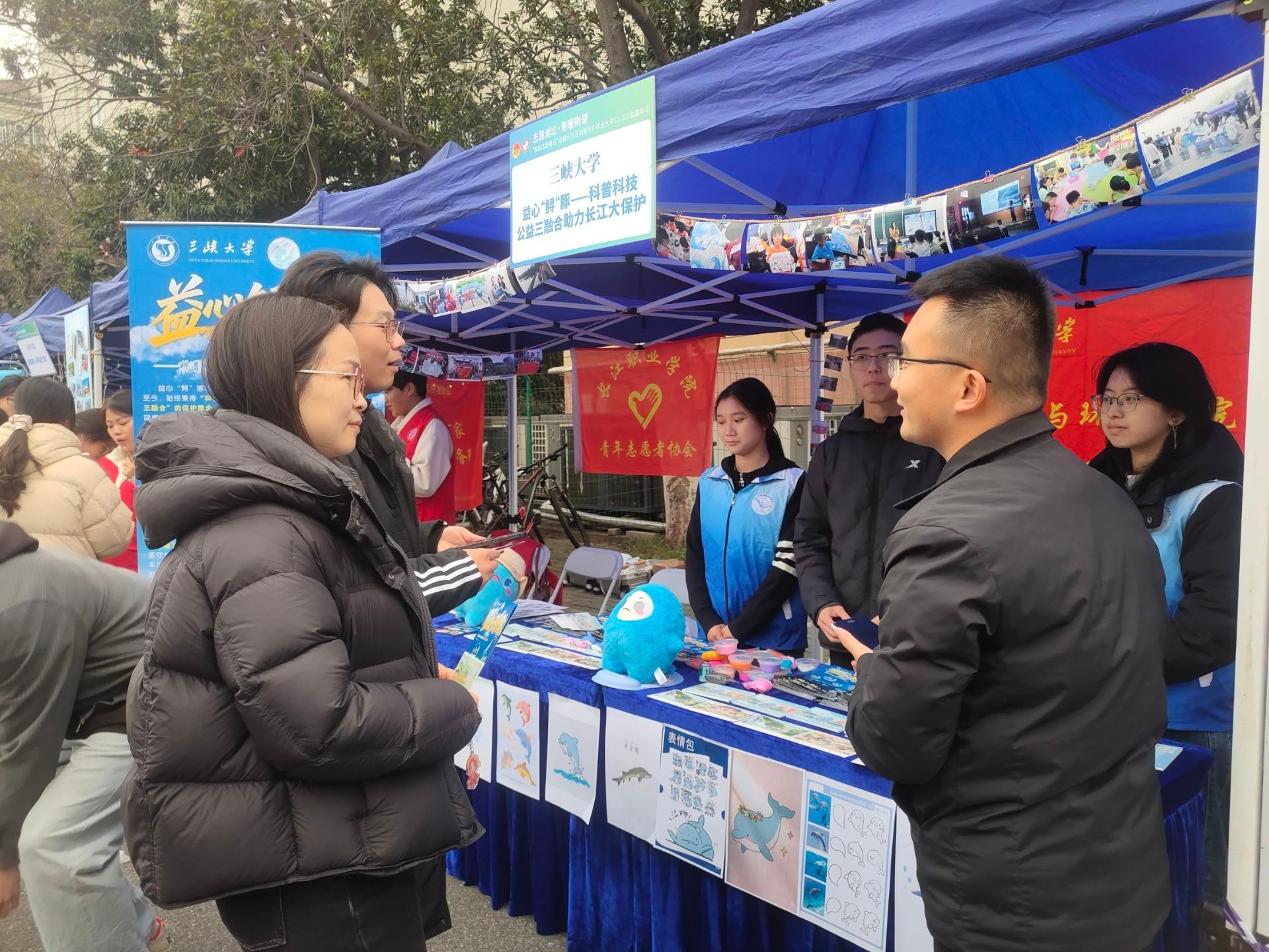 在公益集市展区,beat365展位成为焦点。核心展台上,秋叶拼贴的微缩建筑模型将土木工程专业知识与自然美学完美融合;图文展板清晰呈现完整公益闭环;“三分钟秋叶拼贴”互动体验区人气高涨,成为跨校交流的友好平台。