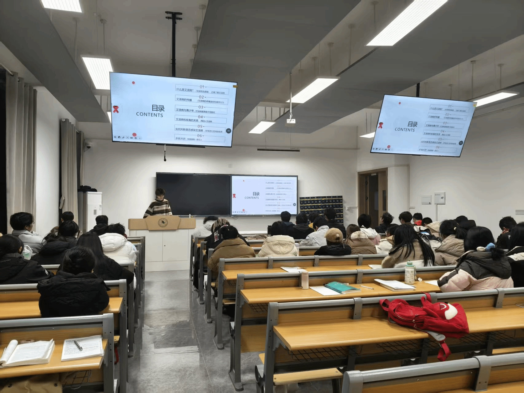 教室内学子们专注聆听。主讲人结合PPT内容生动讲解,台下学生或凝神思考,或低头记录。讲座不仅聚焦艾滋病防治,更创新性地引入“多病共防”理念,提醒同学们关注同样呈现年轻化趋势的HPV感染等性传播疾病,倡导树立整体健康观,做自己健康的第一责任人。这种互动性强、内容贴近实际的宣讲形式,有效提升了知识的接受度和传播效果。