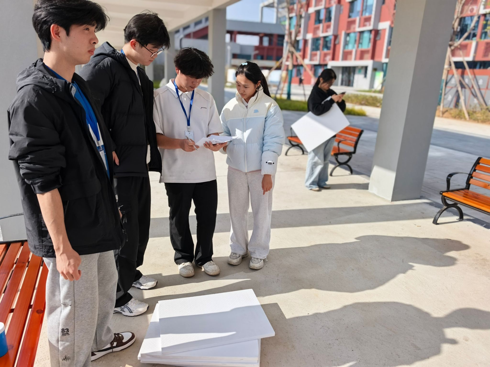 在新校区一号宿舍楼下,木板、胶水、颜料、零件等各式各样的模型制作材料,从基础的搭建耗材到精细的装饰配件,一应俱全。负责发放材料的各部门成员耐心地为同学们讲解材料使用说明,细致核对领取清单,确保每位参赛同学都能顺利拿到所需物资。同学们的脸上满是兴奋与期待,有的同学早早列好了材料清单,认真核对每一项物资,生怕遗漏关键配件;有的三五成群围在一起,一边领取材料,一边热烈讨论着模型的设计思路。