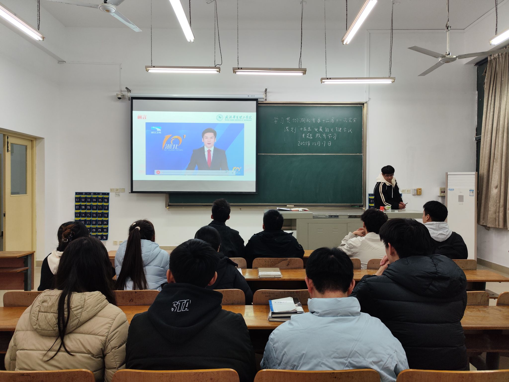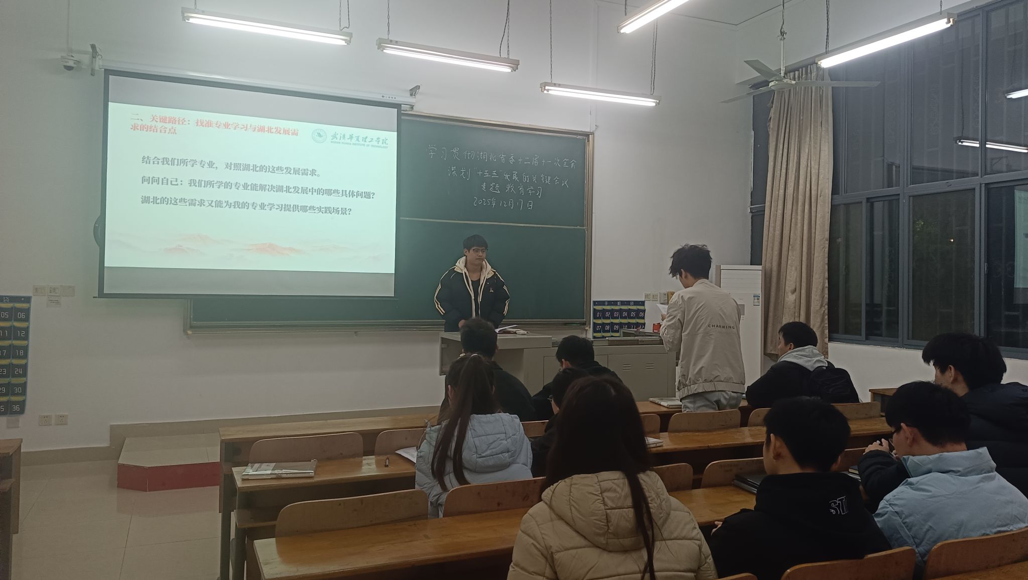 为深入学习贯彻湖北省委十二届十一次全会精神,引导学生党员将个人成长融入湖北“十五五”发展大局与学校建设实践,2025年12月17日17点50分,土木建筑工程学院党员服务站于教学楼 1-102召开十二月理论学习。党员服务站全体成员参会,会议由焦锦同学主持。