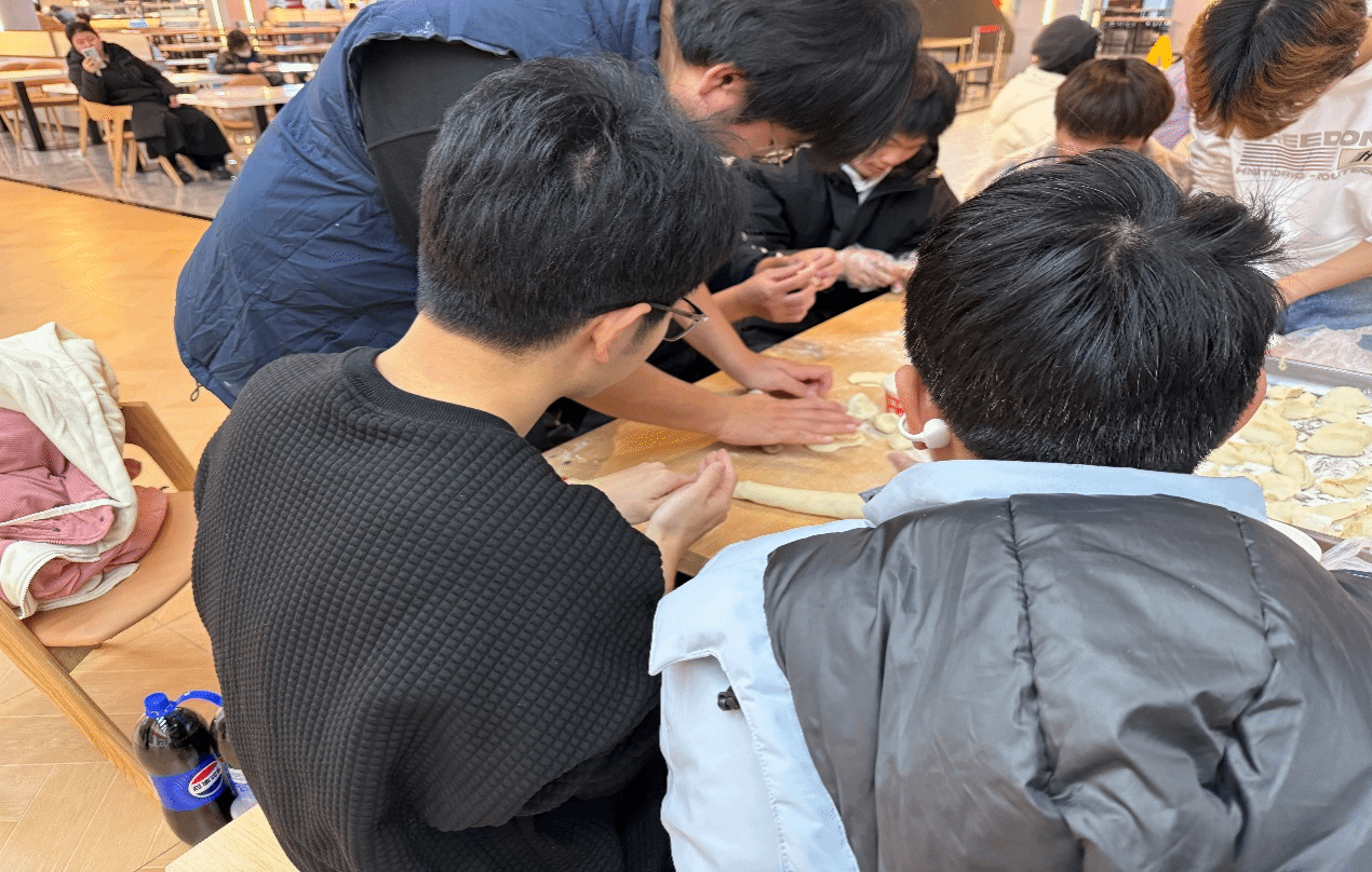 活动尚未开始,现场已是一派热火朝天的景象。桌椅整齐排列,雪白的饺子皮、鲜香的馅料等原材料,擀面杖、托盘等炊具一应俱全。食堂工作人员们精心准备,将食材摆放就位,等待着师生们大显身手。活动开始后,大家纷纷撸起袖子,和面、擀皮、包馅、捏合,一系列动作行云流水。现场既有经验丰富的“老手”,手法娴熟,包出的饺子造型精致、饱满圆润;也有初次尝试的“新手”,在身边伙伴的指导下,从手忙脚乱到逐渐熟练,一个个形态各异的饺子在指尖悄然诞生。大家边包边聊,分享着包饺子的技巧和冬至的习俗,同学们的谈笑声回荡在活动现场,现场一片祥和安宁的氛围。