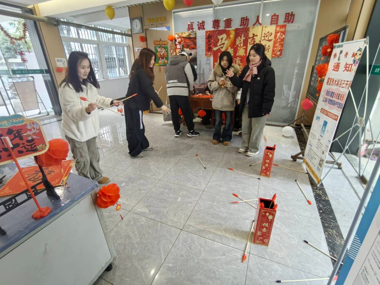 另一边的游园会区域同样热闹非凡,各类趣味游戏吸引了大批同学参与。写“福”字、写对联、知识问答、投壶等经典活动轮番上阵,同学们踊跃挑战,在游戏中收获欢乐与惊喜。每完成一项活动,同学们就能兑换到专属“印章,并以此来兑换小礼品,同学们积极踊跃地参与活动,促使现场的欢乐氛围持续升温。