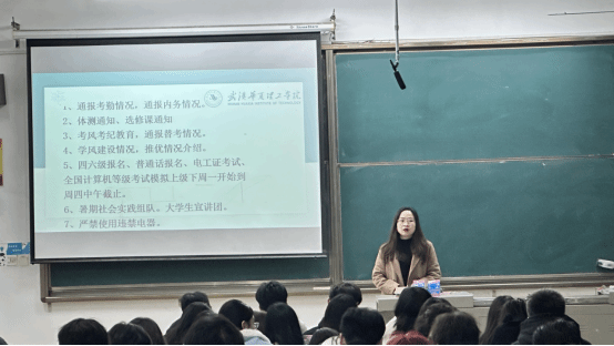 此外,黄老师还强调了考风考纪教育的重要性,通报了替考等违纪行为的情况,呼吁同学们诚信考试,严守考试纪律。同时,辅导员介绍了学风建设情况和推优情况,鼓励同学们努力学习,争取成为优秀的大学生。