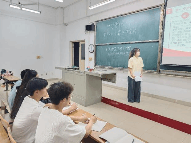 2024年9月12日傍晚6点30分,土木建筑工程学院党员服务站在教学楼1—301教室召开了关于学习贯彻党的二十届三中全会精神的理论学习活动。活动由预备党员徐靖柔同志主持,全体22级预备党员参加。