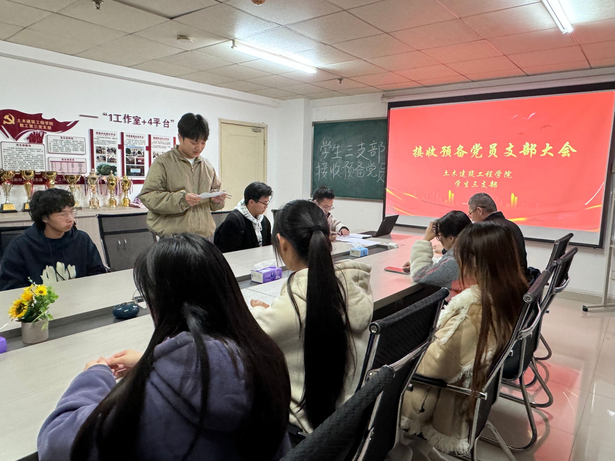 2024年11月26日下午18点,土木建筑工程学院学生第三支部在综合楼1021会议室召开了关于接收预备党员会议,本次活动由第三党支部书记程鹏同志主持,院党总支副书记郝志康同志出席并指导,支部党员余梦雪、周传祺、范楚枫、金伟音、陈思涵、陈蕊、周雨晴、王培悦、曹逸阳、徐靖柔、王家乐、吴洪亮等人参加。此次会议,不仅是对预备党员同志成长历程的一次重要见证,更是学院党建工作深化推进、党员队伍不断壮大的又一里程碑。