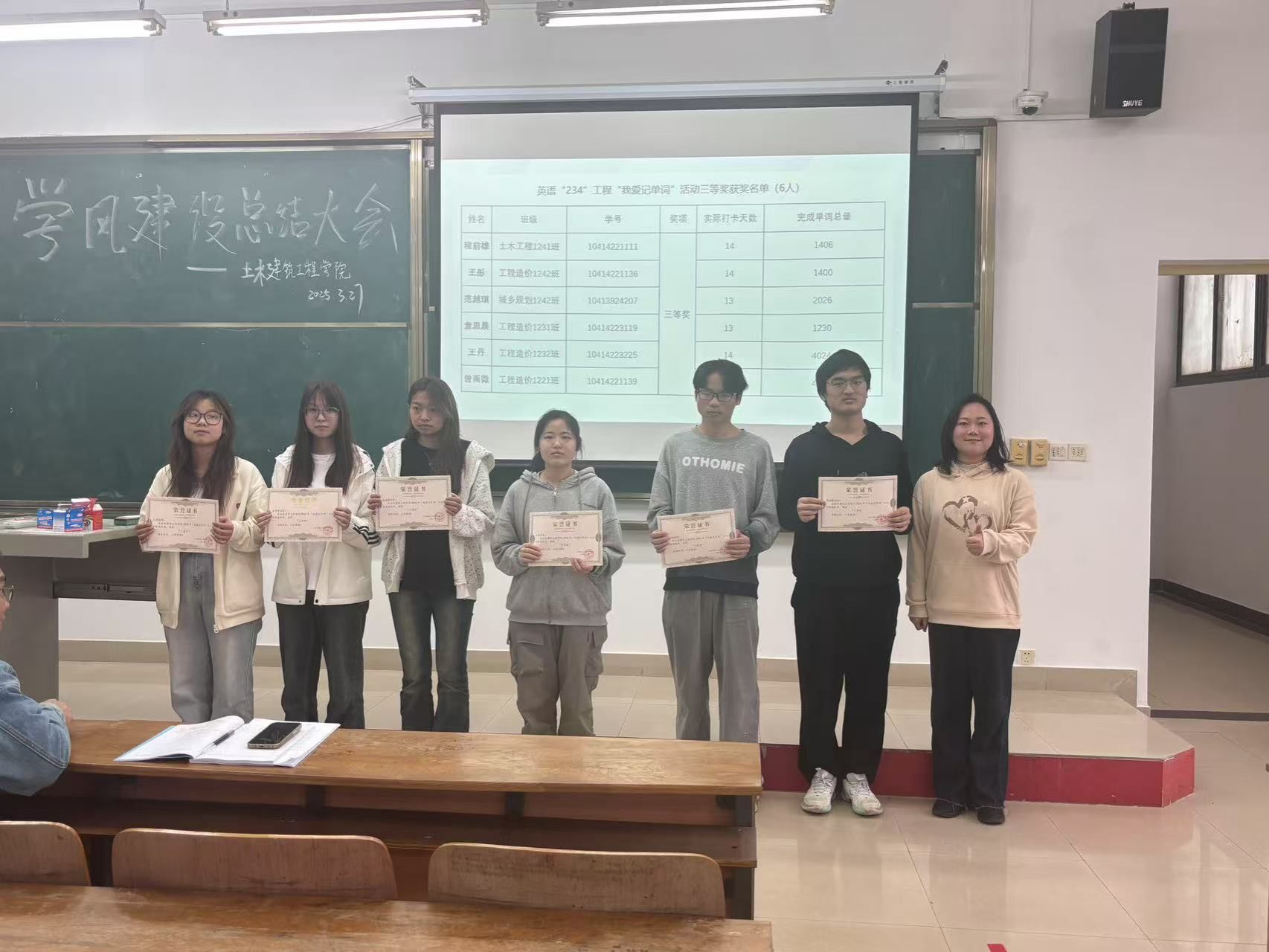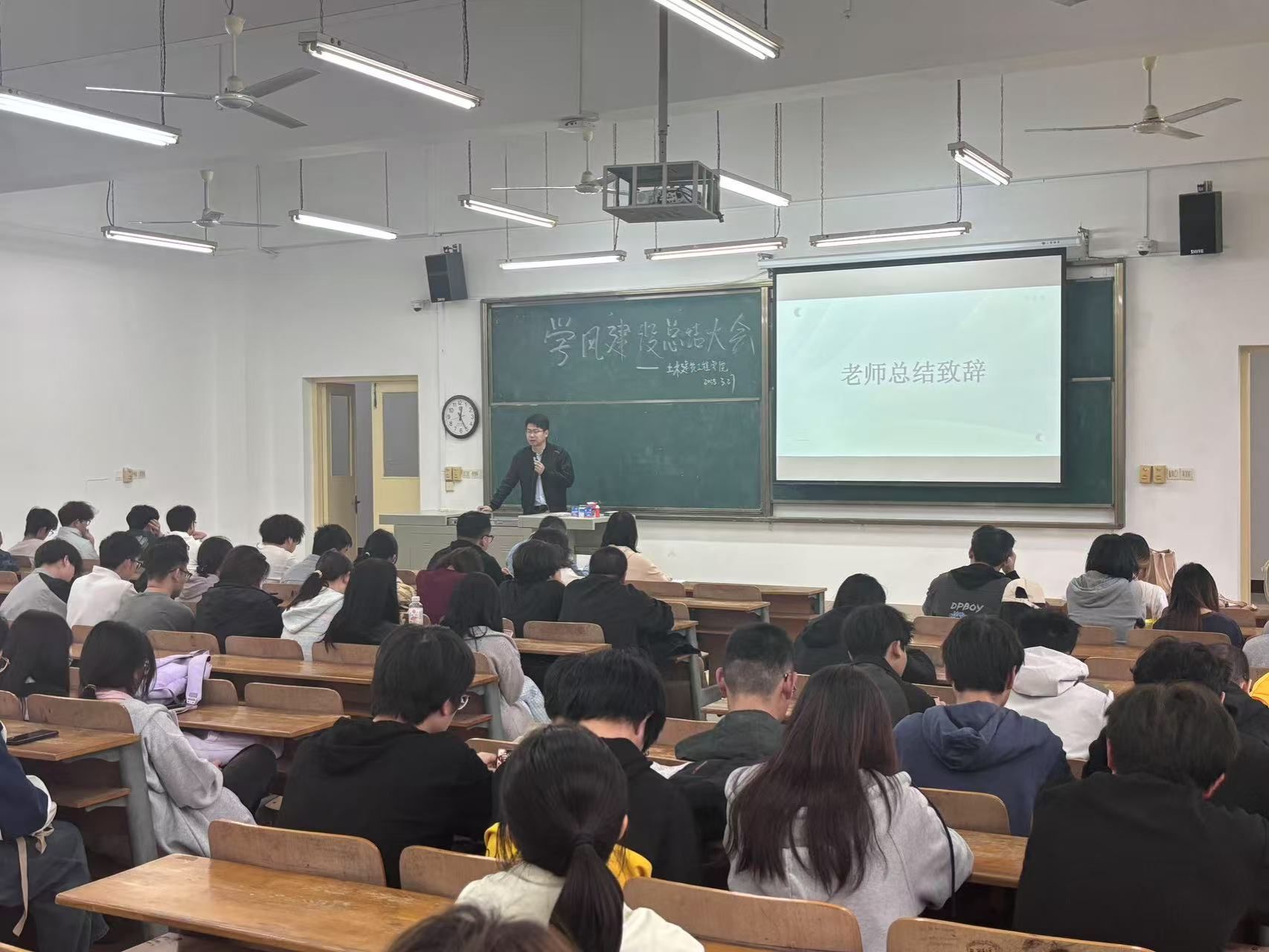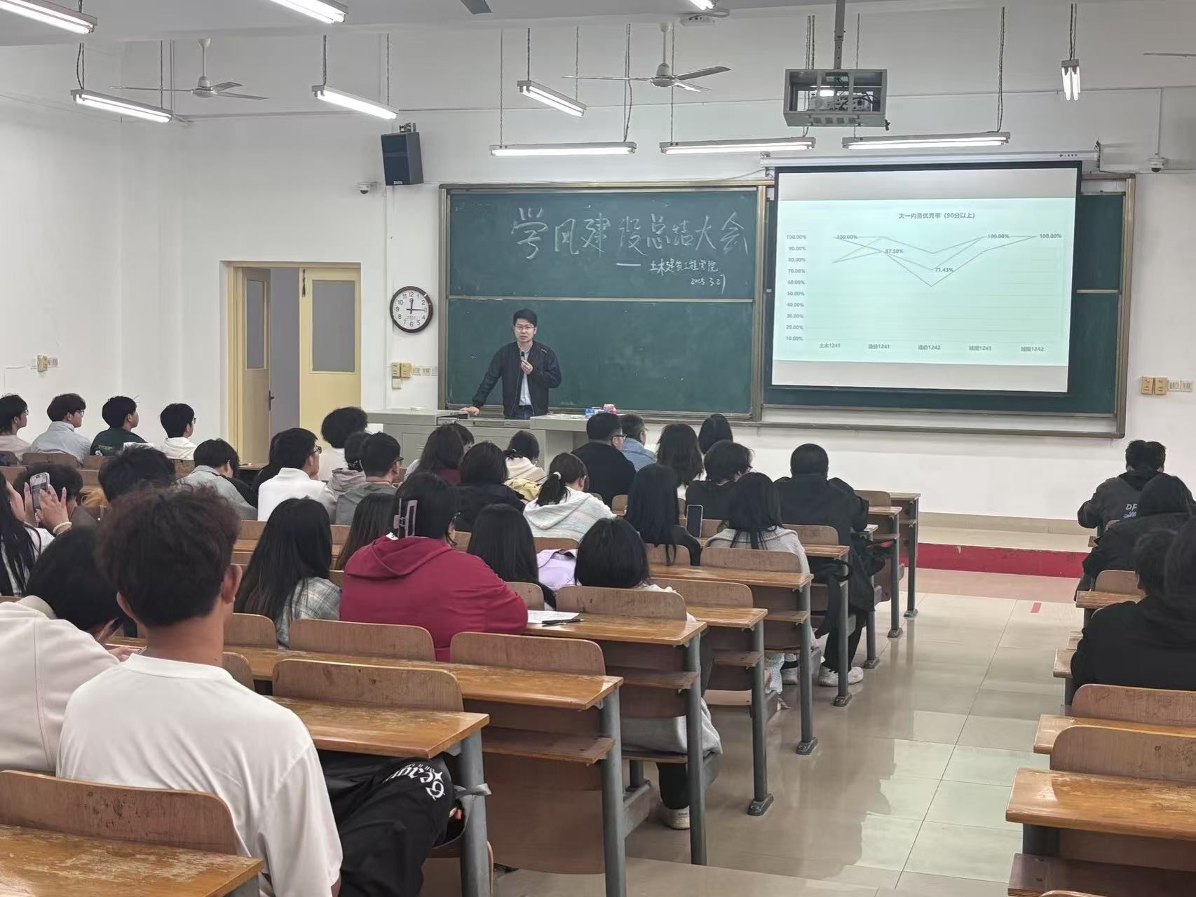为了营造良好的学习和生活环境,提高同学们的纪律意识,2025年3月27日,土木建筑工程学院于1-101举办了学风建设总结大会,出席本次会议的有学工办主任杨柳、团总支副书记昌仪琳老师、24级辅导员姚卓夫、各班班委、各学生组织代表。