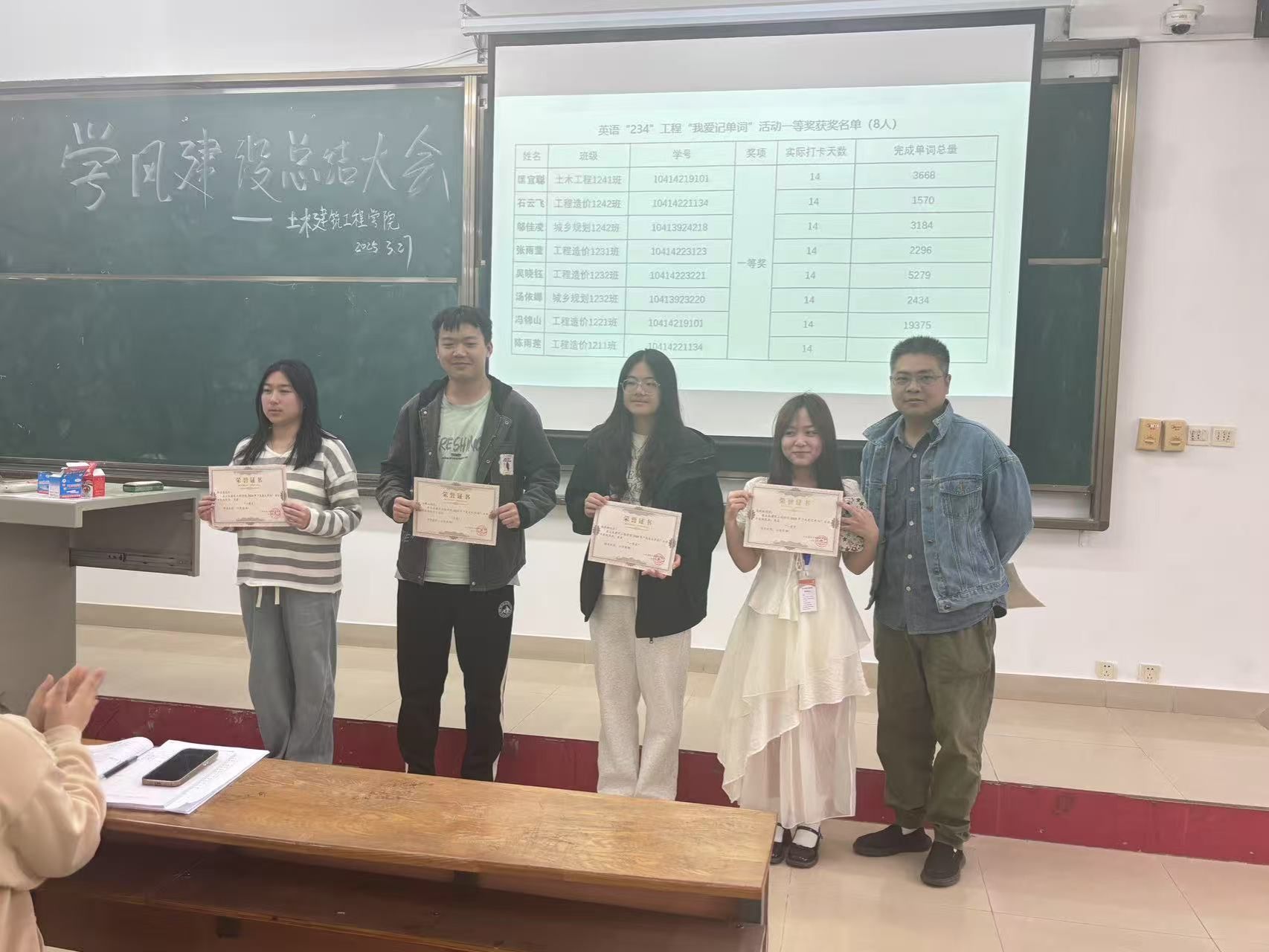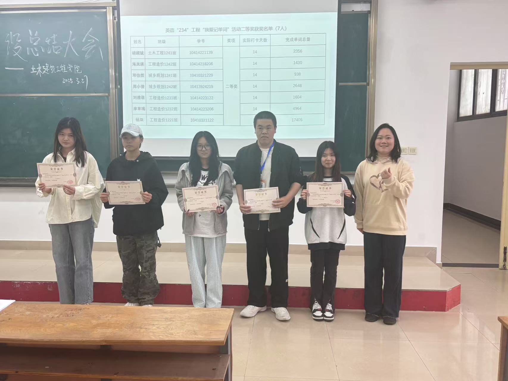 他还强调了四六级备考不能懈怠,分享了四六级考试的学习方法和经验,距离四六级考试还有两个月左右,希望同学们抓紧时间备考,预祝大家顺利通过考试。最后,由昌仪琳老师和姚卓夫老师上台为我爱记单词比赛获奖的同学们进行了颁奖。